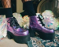 Up the ante in Anarchic Boots! Features a vegan friendly, combat style boot with a black faux leather upper and lace up detail overlaid with double buckle straps at the ankle. Has side zipper closure for easy on/off and a 1.5″ heel height