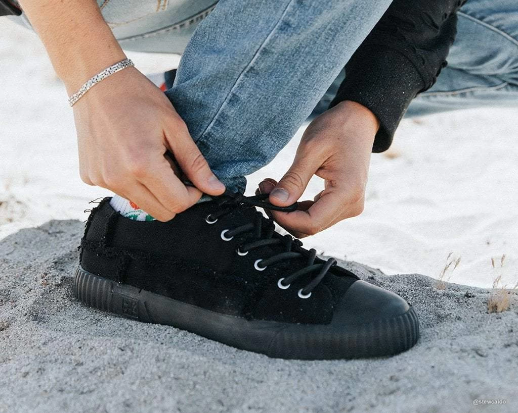Hit the streets and go anywhere in laidback style with these low top sneakers. Features a sleek all-black fabric upper with frayed detailing for an finishing touch. Lace up closure and has removable memory foam insoles for added comfort. Vegan friendly!