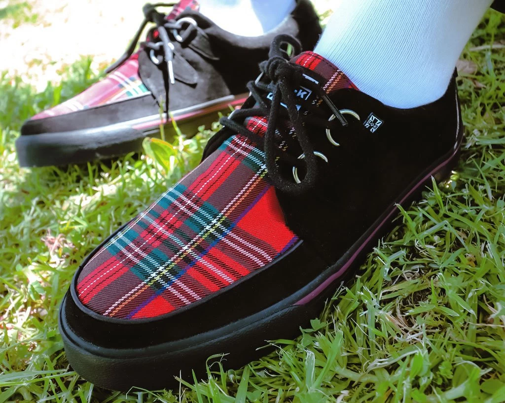Mad for plaid? Us too. Indulge your inner grunge kid with these kicks featuring a vegan friendly black microfiber upper contrasted by a rad, eye-catching red tartan plaid front. Features our vulcanized VLK creeper sneaker silhouette that lends everyday wearability. D-ring lace up closure and has a lightly padded tongue along with removable memory foam insoles for added comfort.