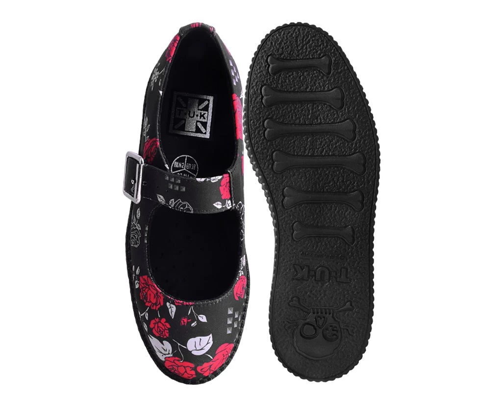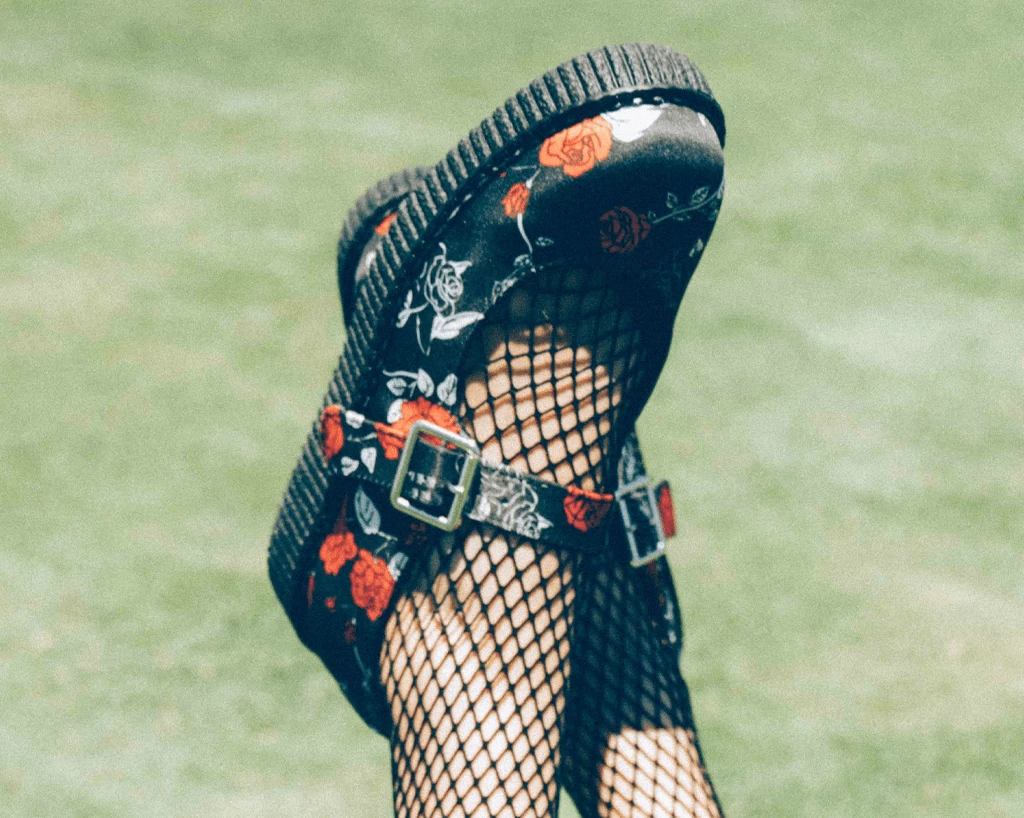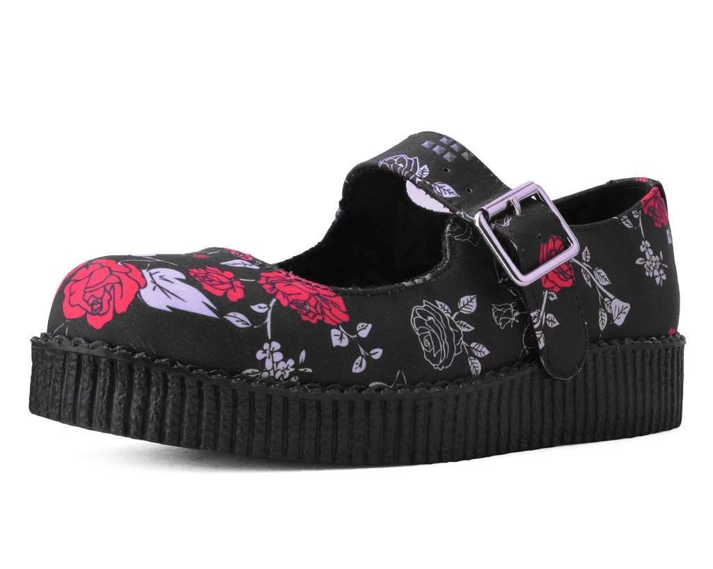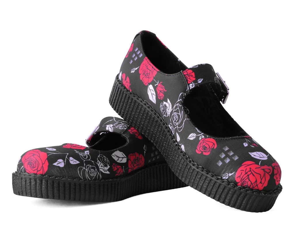 Studs N’ Roses. Features a low platform height that is approximately 1 ¼” at the heel and ¾” in the front and is made of a mixture of EVA and rubber that contributes to the sole’s bendability. Has an all-black velvet upper and comes with removable memory foam insoles for added comfort.