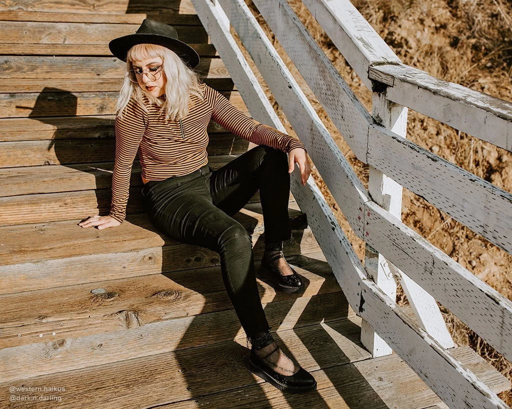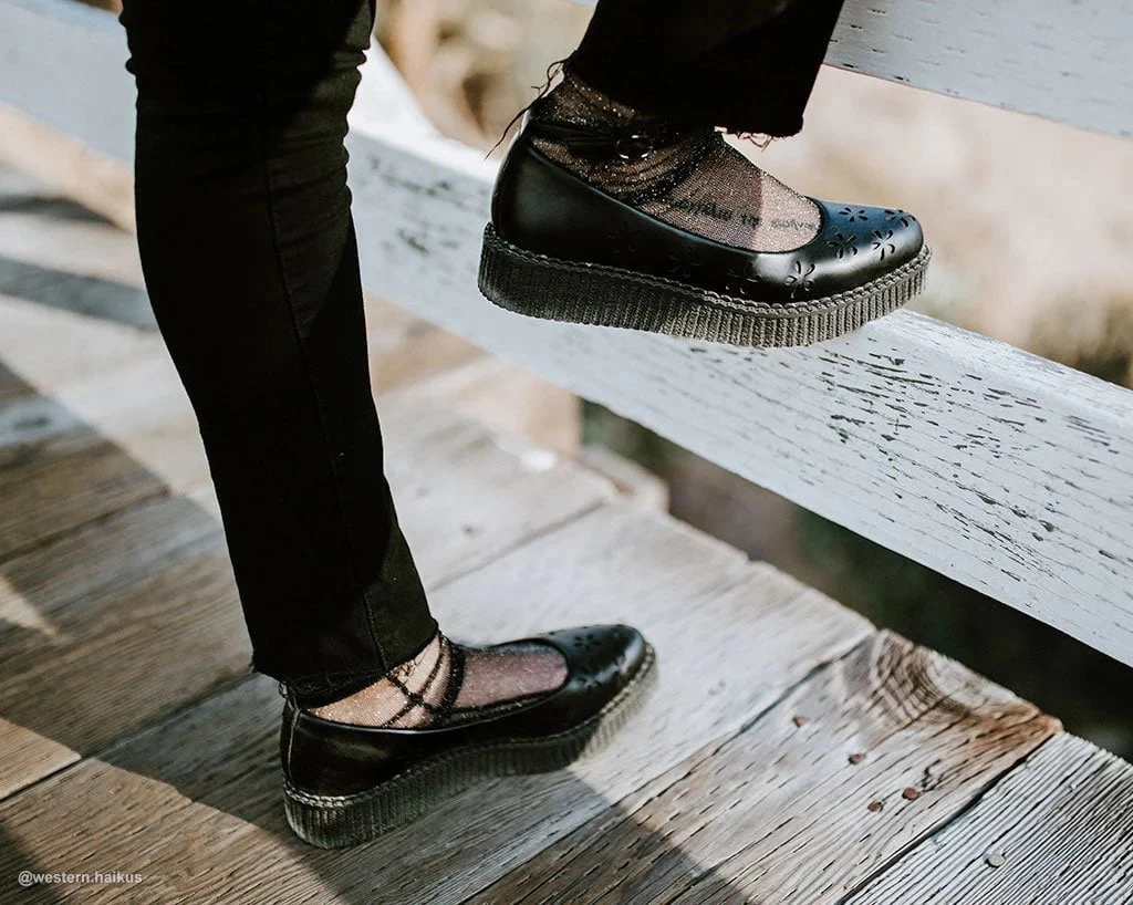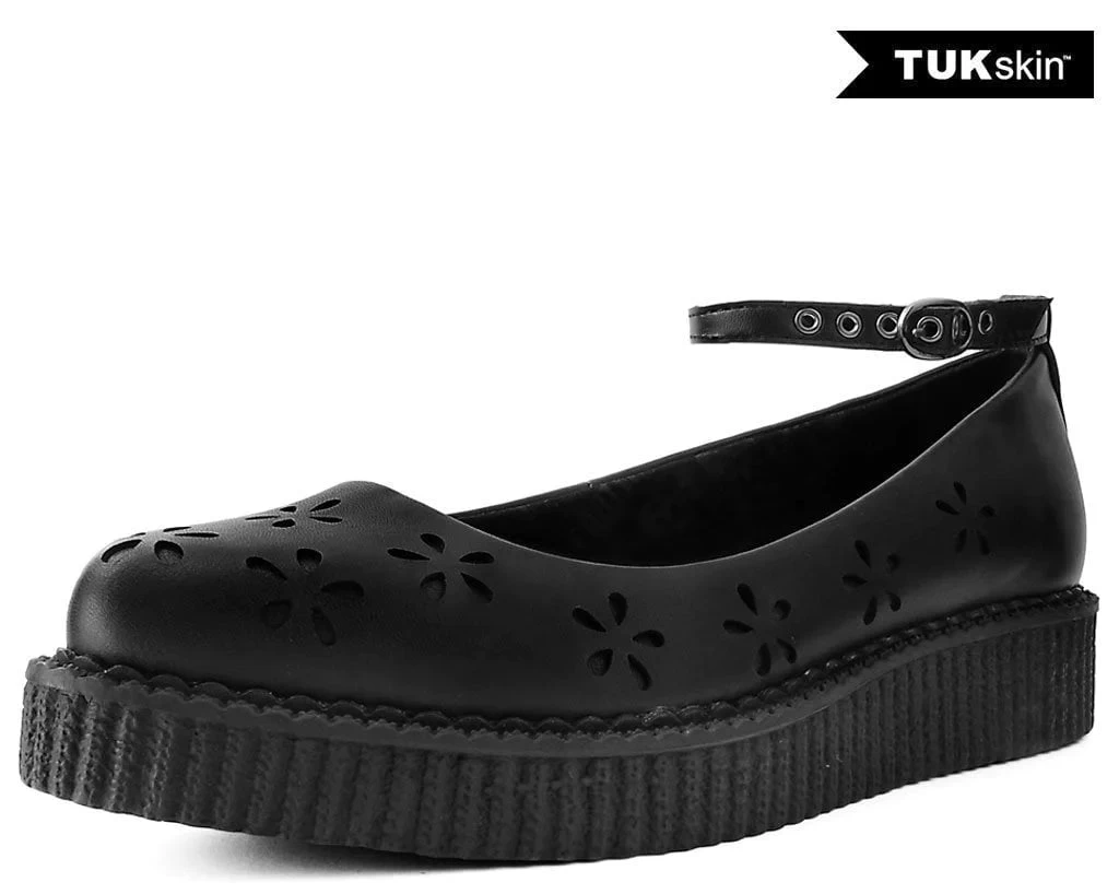 Shoes so good you’ll make ‘em want an encore. Get ready to take center stage in these showstoppers featuring the perfect combo of a ballet flat and creeper platform contruction. Has an all-black upper with a mega cute flower design all over. Made of our high quality TUKskin™ material — polishable synthetic faux leather that is both soft and breathable. Features a pointed-shaped toe, ankle strap closure for an adjustable fit, and sits on top of a low sole creeper platform that measures 1 ¼” at the heel and ¾” in the front. Has removable memory foam padding for added comfort.