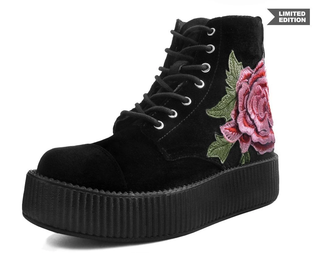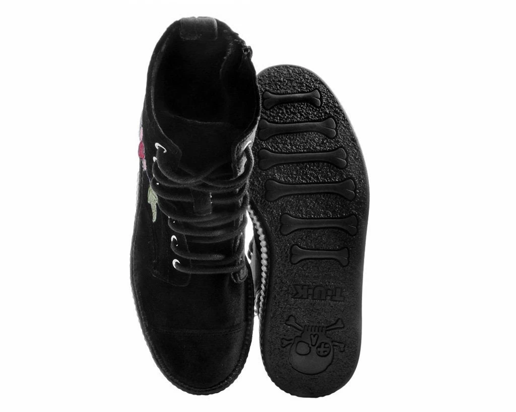 Show ‘em you’re tough as thorns but a romantic too with these limited edition combat boots! These babies are the perfect combo of masculine and feminine aesthetics with its lush black velvet upper complemented by an intricate pink and red three-dimensional embroidered rose at the toe. Features our lightweight VIVA mondo sole that is approximately 1 ¾” at the heel and 1 ¼” in the front. Has a side zipper for easy on/off and removable gel insoles for added comfort. Vegan friendly!