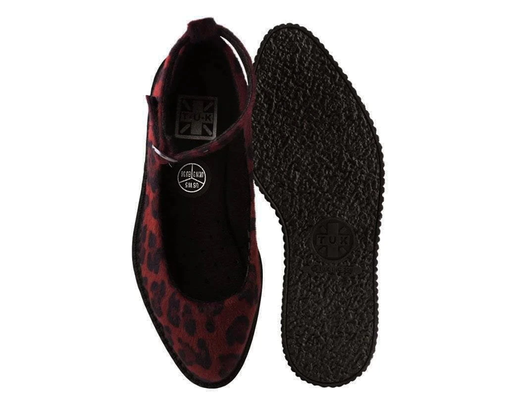 These vegan friendly mary janes are essentials. Features a vegan friendly burgundy leopard upper with pointed toe construction and ankle strap closure for an adjustable fit. Sits on top of a low sole creeper platform that measures 1 1/4” at the heel and 3/4” in the front. Has removable memory foam padding for added comfort.