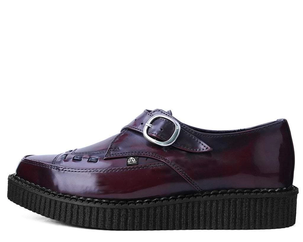 Go for bold and keep your shoe game looking sharp in these pointed-toe creepers. Features a vegan friendly faux leather burgundy rub-off upper that lends a worn and lived in look with a monk buckle strap closure. Has twill lining, foam padding insole, and a low sole platform that is about 1 ¼” at the heel and ¾” in the front.