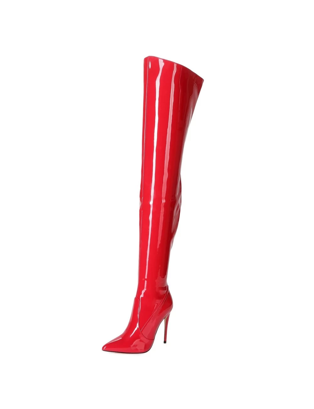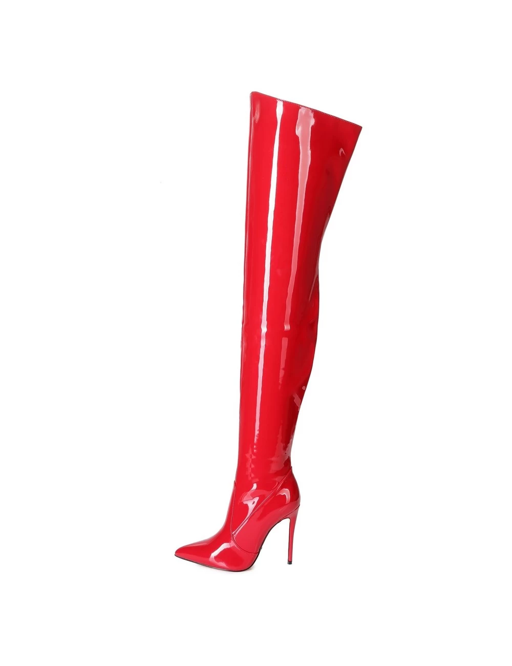 Thigh high elegant Italian style boots with 11cm heels, no platform, red lining and full length zipper in RED SHINY.