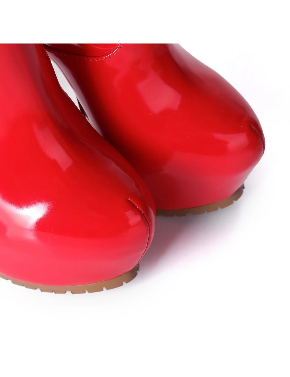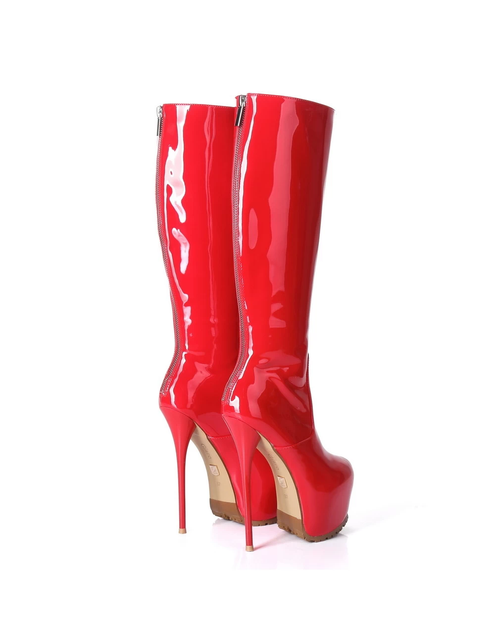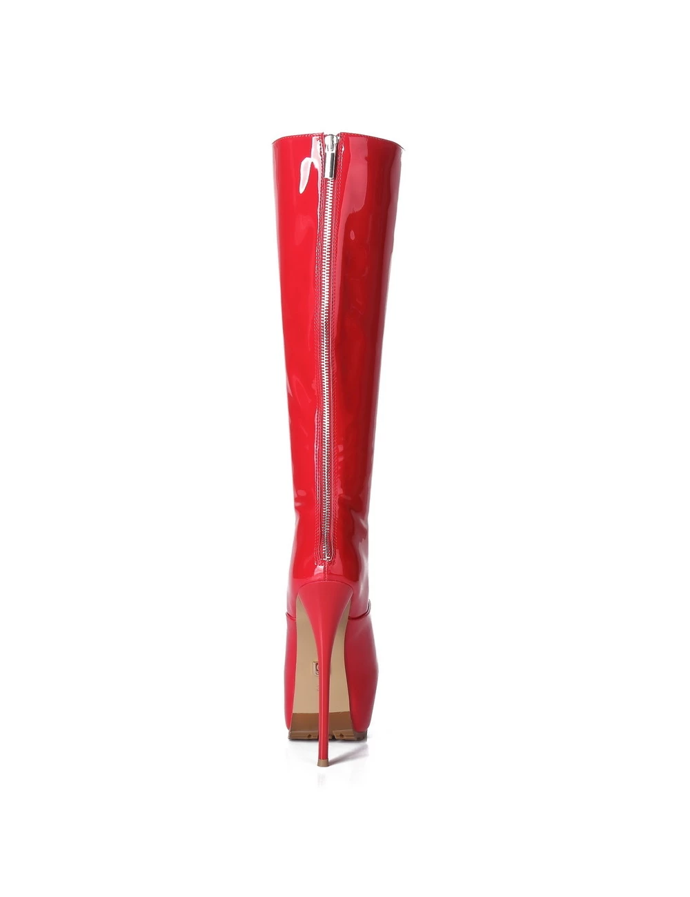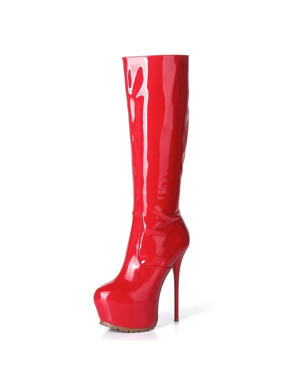 These sturdy platform knee boots are powerful. Beautiful zippers on the backside. Shiny material from toes to the top right under your knees. Profile soles and robust shiny material. Long shiny heels and distinct rubber profile soles. New 2020 Collection.