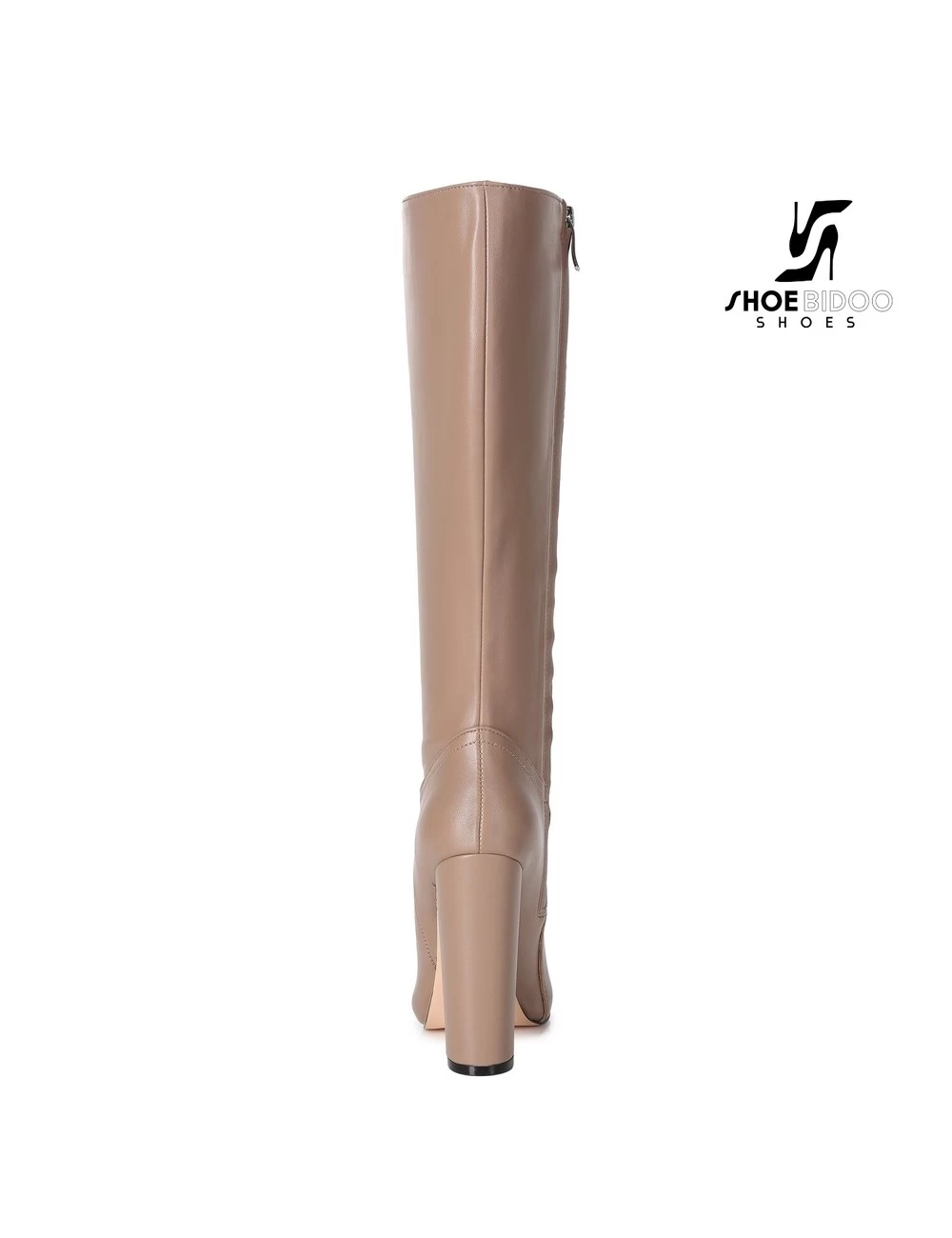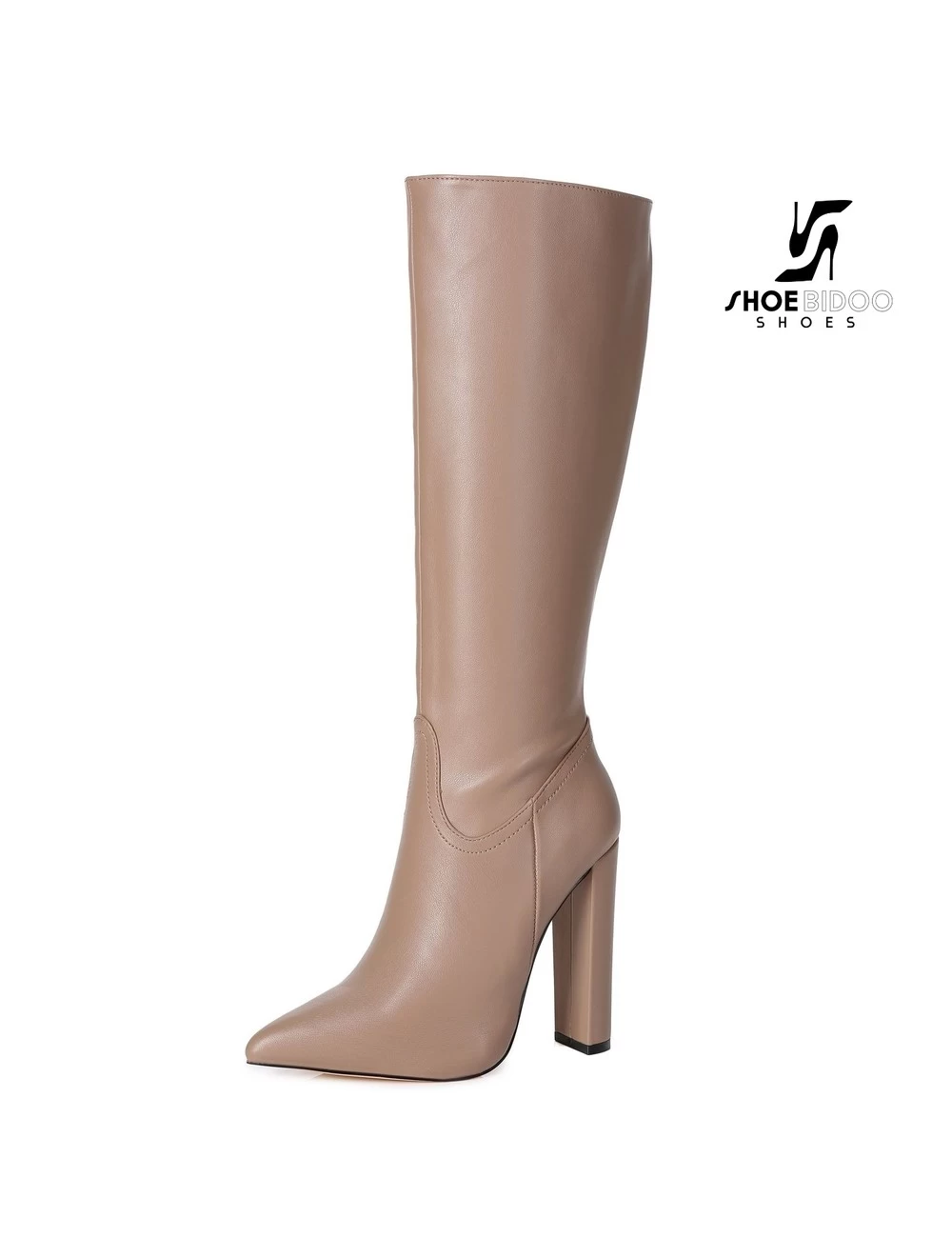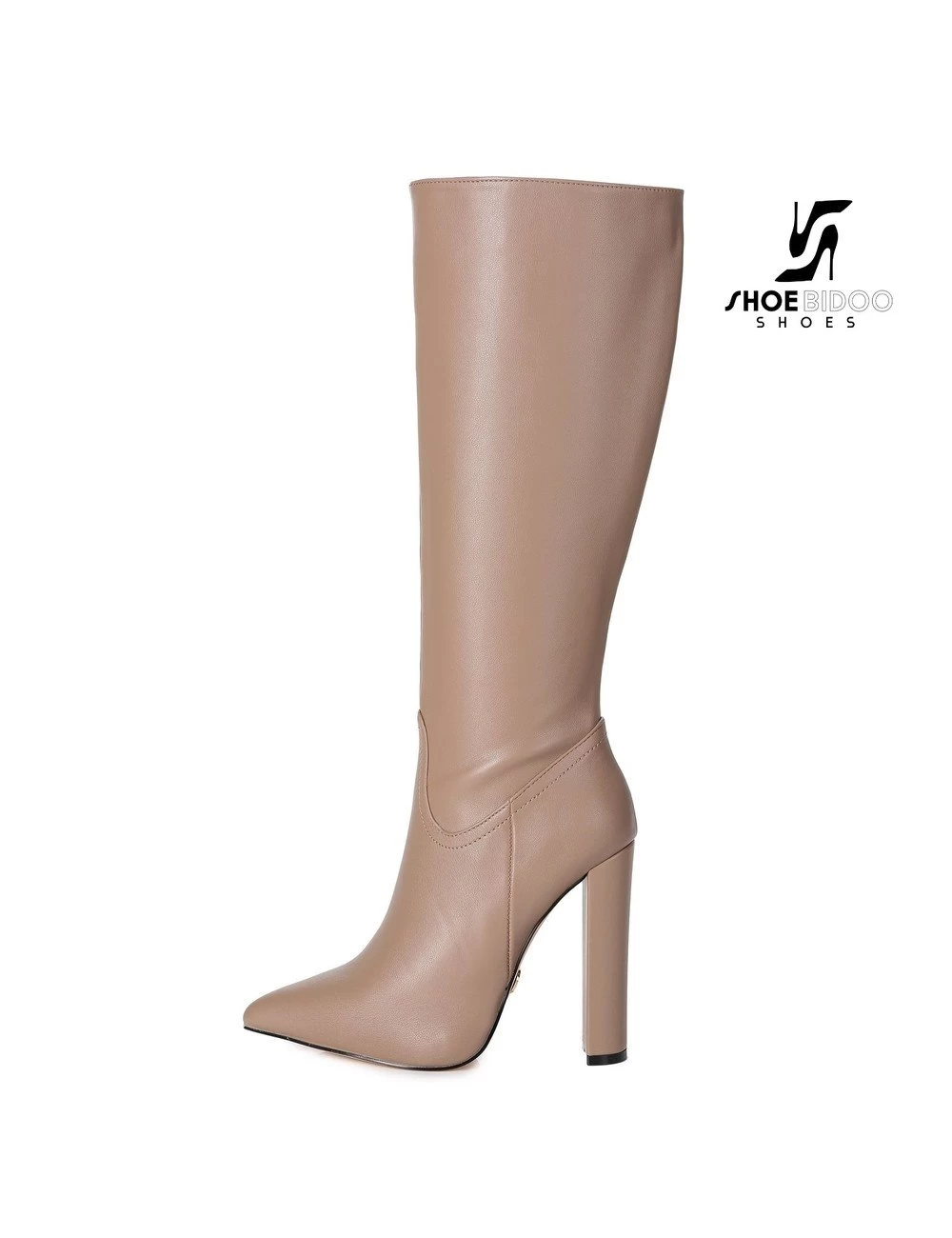 Super tight-lined knee boots with sturdy high heels. Beautiful classic fashion boots in taupe with a light sole. Combines with almost anything. Easy to wear with an effective walking height of 12cm high heels on size 38. Nice pointed noses give you the designer look at an affordable price.
