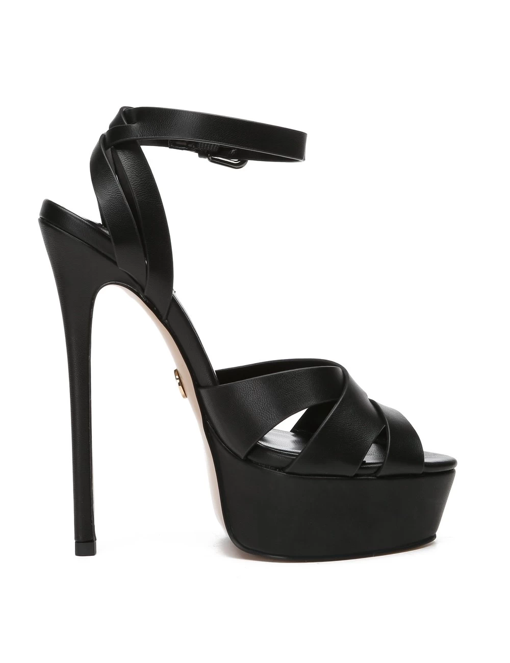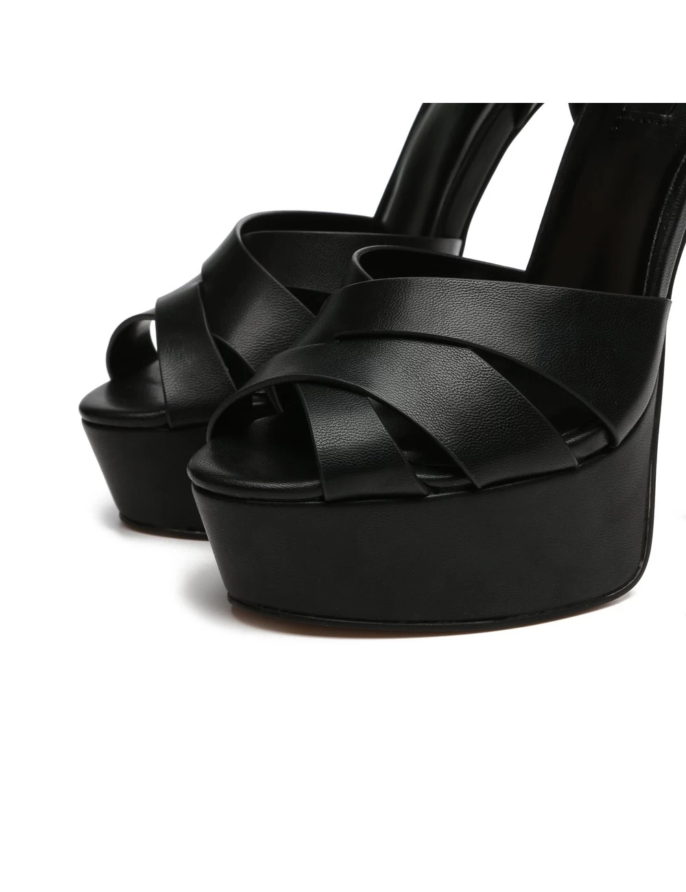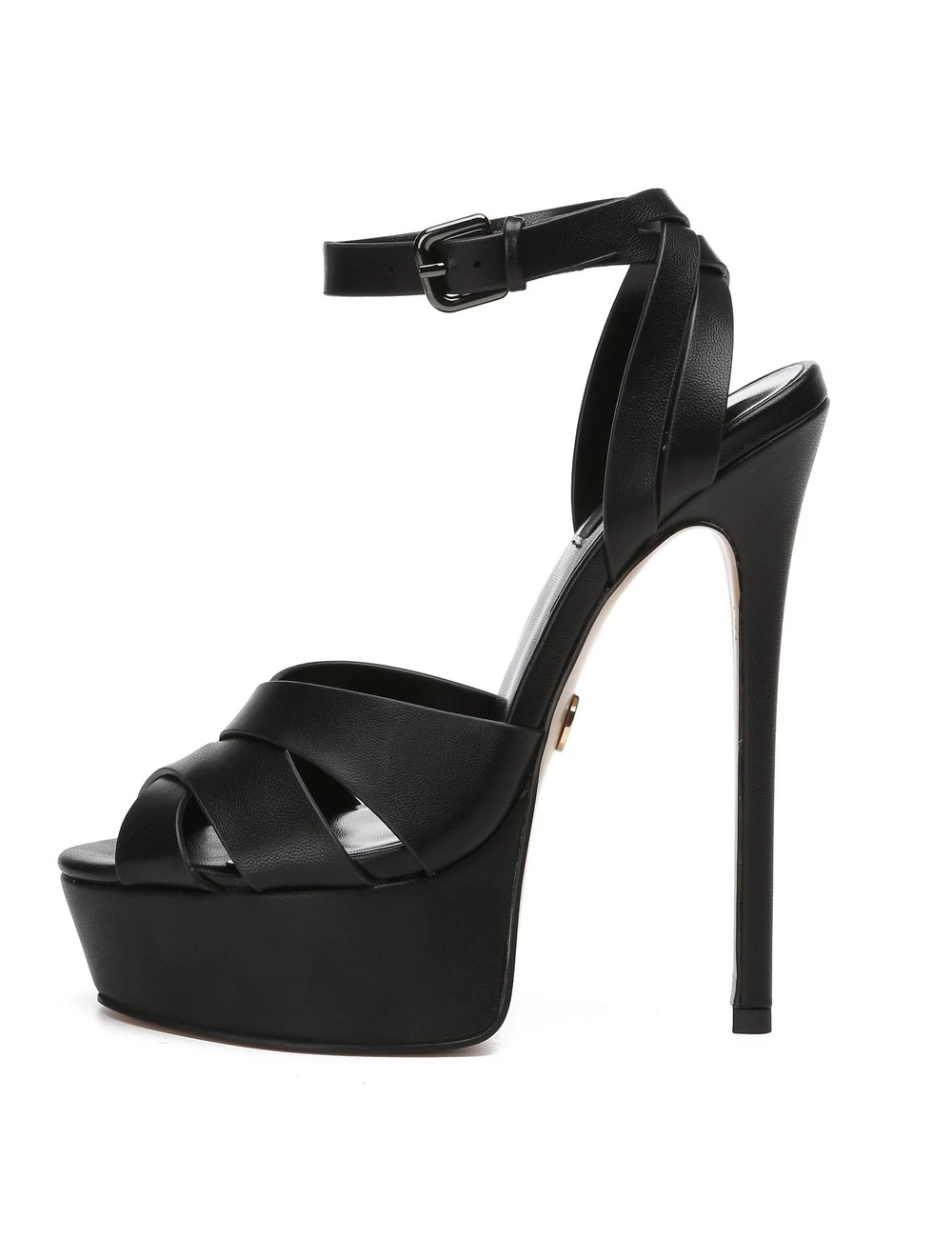 Turn heads in this stunner of a sandal! An extreme platform sole and towering heel accentuate the simple strappy upper for a leg-lengthening look that will enhance any outfit. The straps are slightly different from those of the Kori. Vegan leather, suede or smooth handmade PU upper material 15cm heel height, 4cm platform