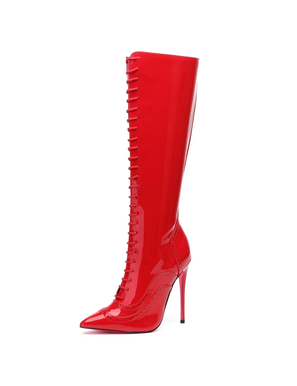Make room in your shoe collection for MILANA, our sexiest boots of the season. These fetish-meets-fashion knee-high stiletto boots are hot with a lace-up front and a zipper on the inside. A 12cm sexy ultra high heel – vegan leather – premium PU material