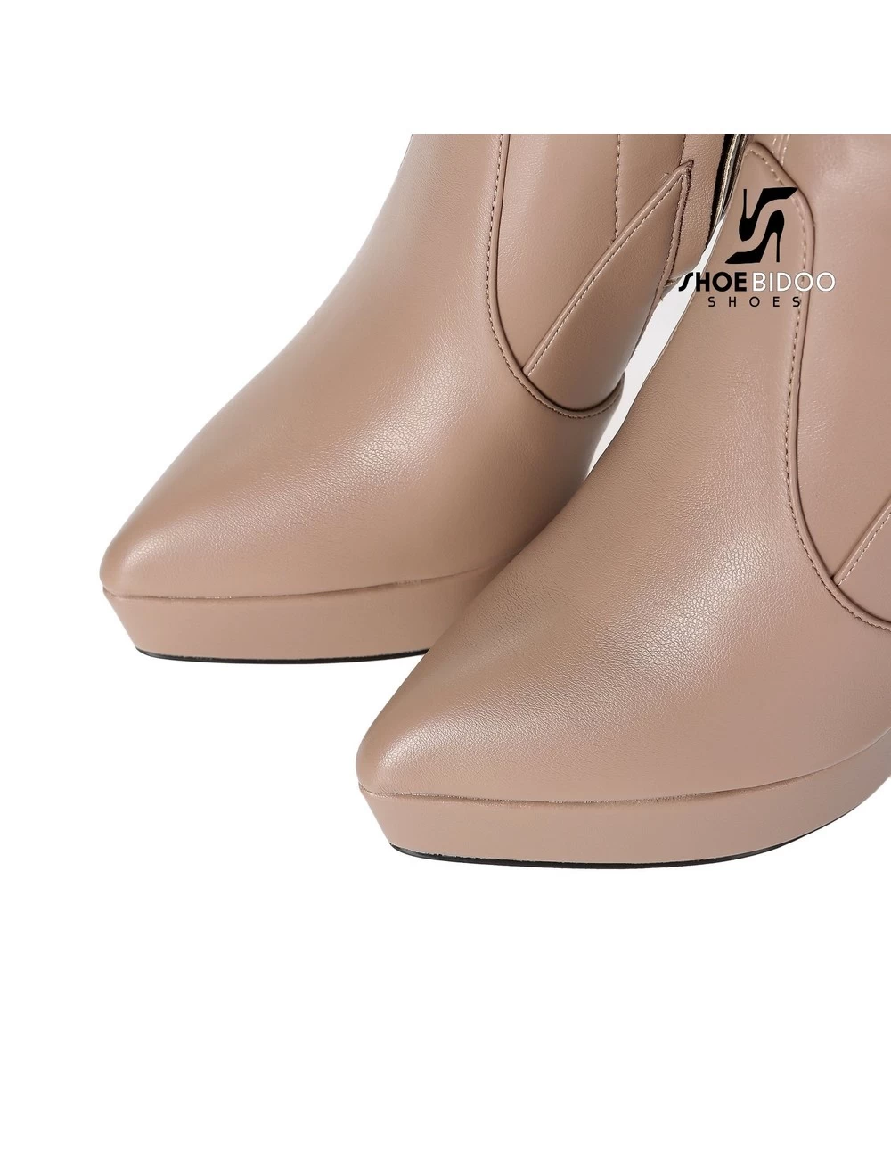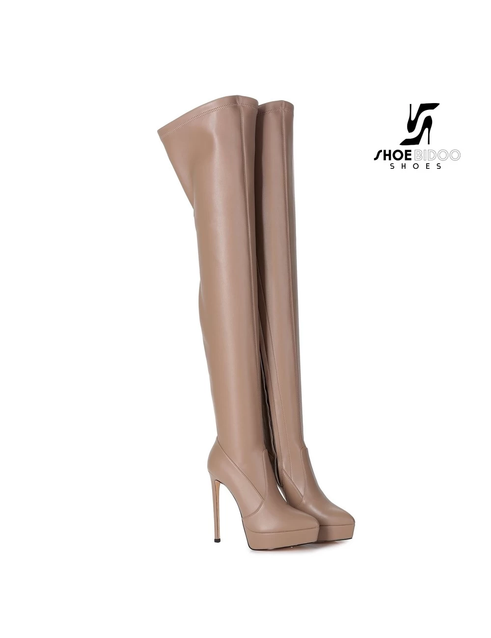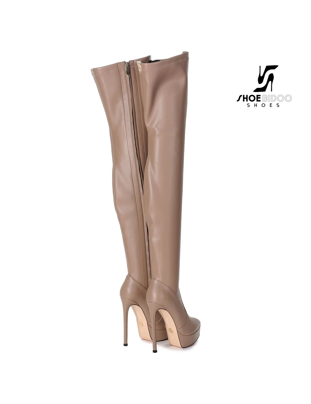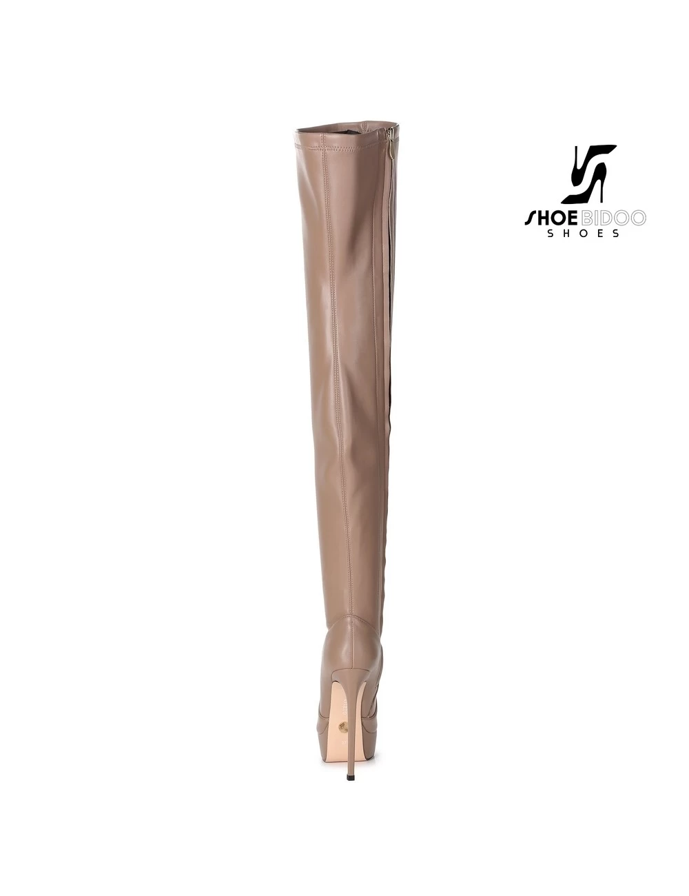 Super sexy stretch thigh boots in taupe vegan leather with a beautiful light sole. Combines with almost anything. Easy to wear with an effective walking height of 11cm high heels on size 38. Beautiful pointed noses give you the designer look at an affordable price.