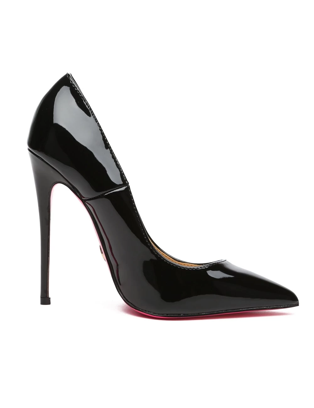 Shiny, sharp and seductive! The TAYA pump delivers all of the above, featuring a tall stiletto heel, pointed toe and reflective patent or printed surfaces. The TAYA heels are available in various materials all with pink soles: Patent leather, printed PU, suede, pony hair, or PU upper material 12cm extreme sexy fetish heels