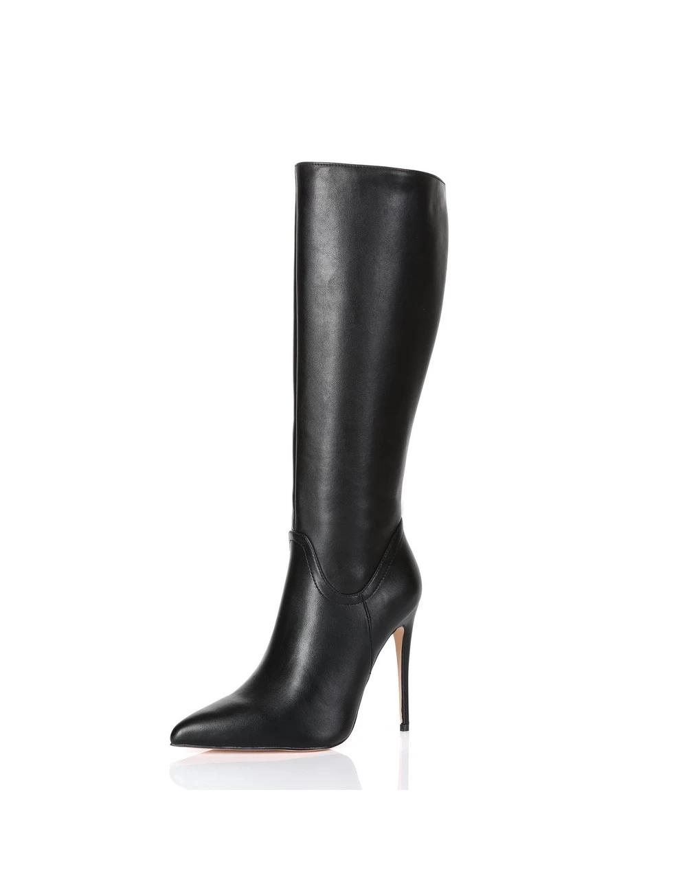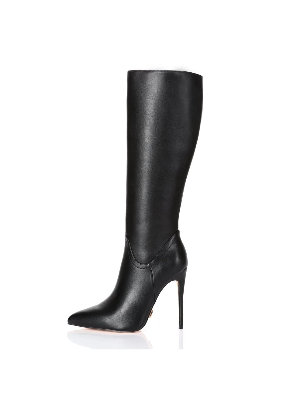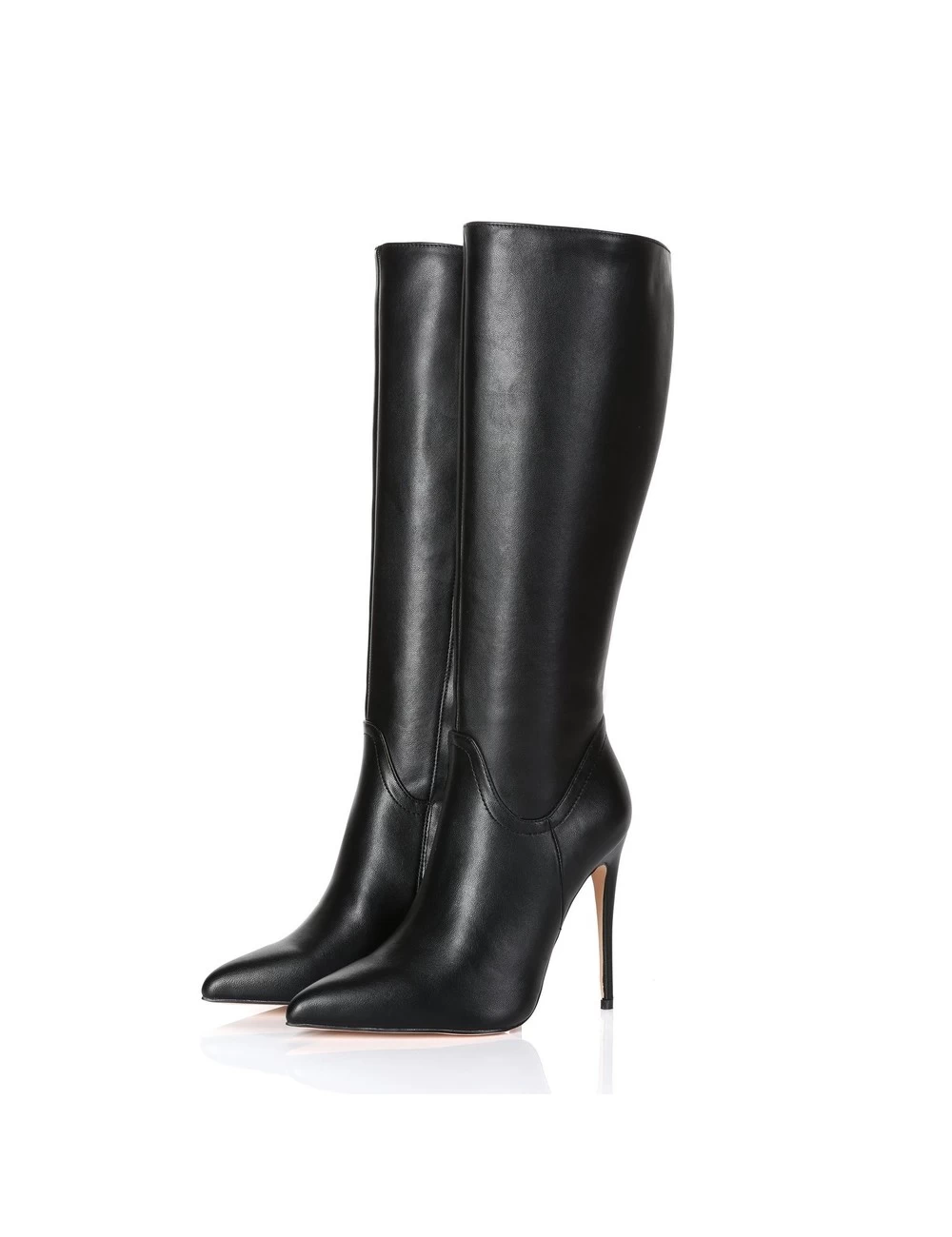 Knee high elegant Italian style boots with 11cm heels, no platform, red lining and full length zipper in BLACK MATTE Vegan PU Leather. The BLACK style is new and has a bit lower heels than the previous ZIRA style. Fit and sizing is the same.