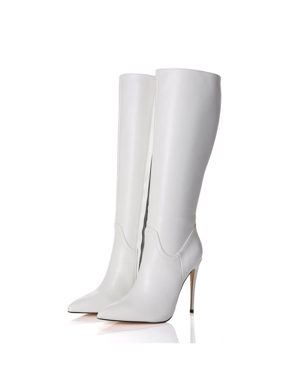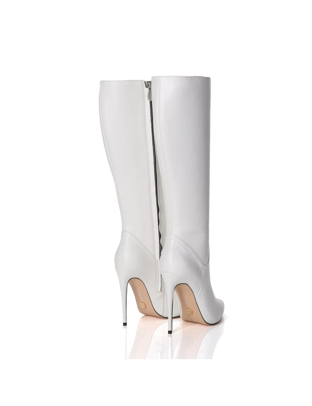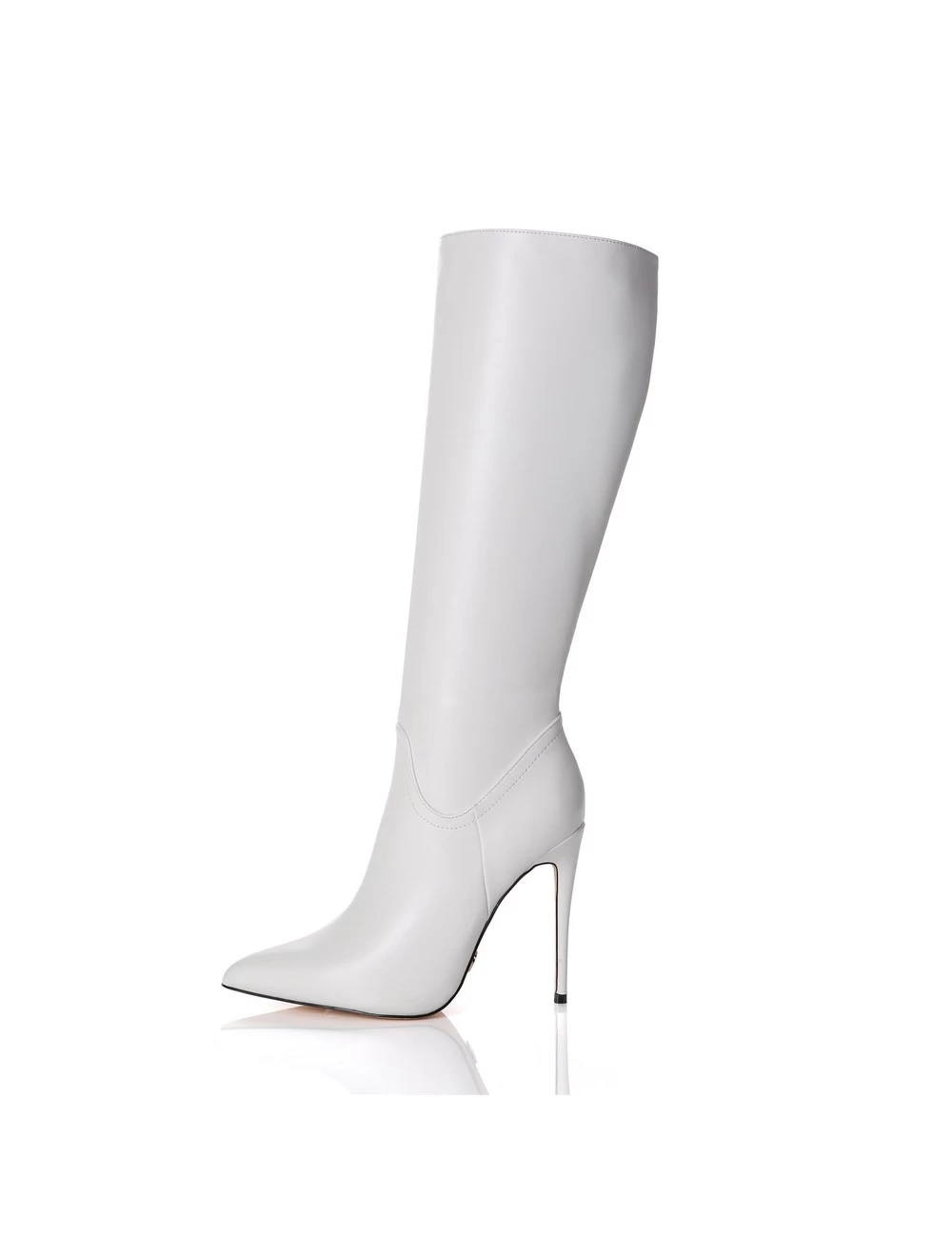 Knee-high elegant Italian style boots with 11cm heels, no platform, red lining and full-length zipper in WHITE MATTE Vegan PU Leather. The BLACK style is new and has a bit lower heels than the previous ZIRA style. Fit and sizing are the same.