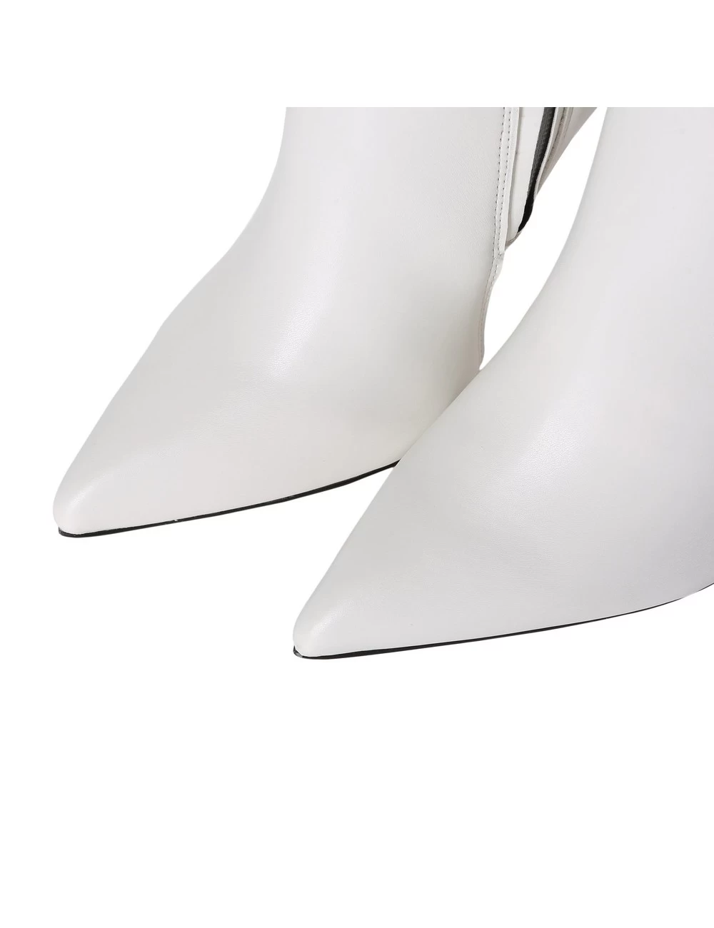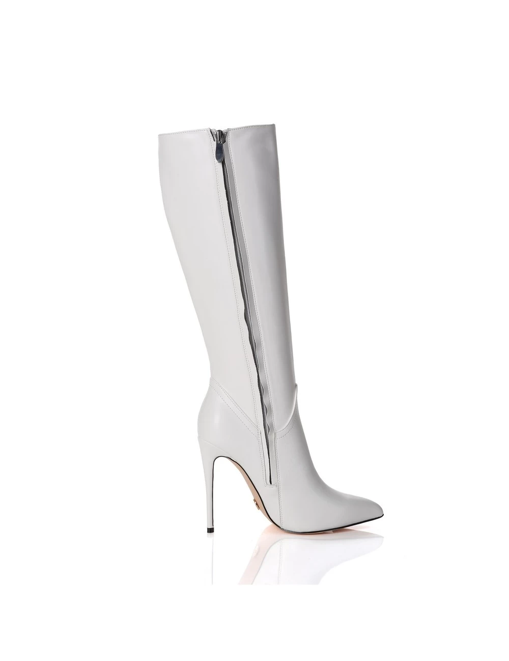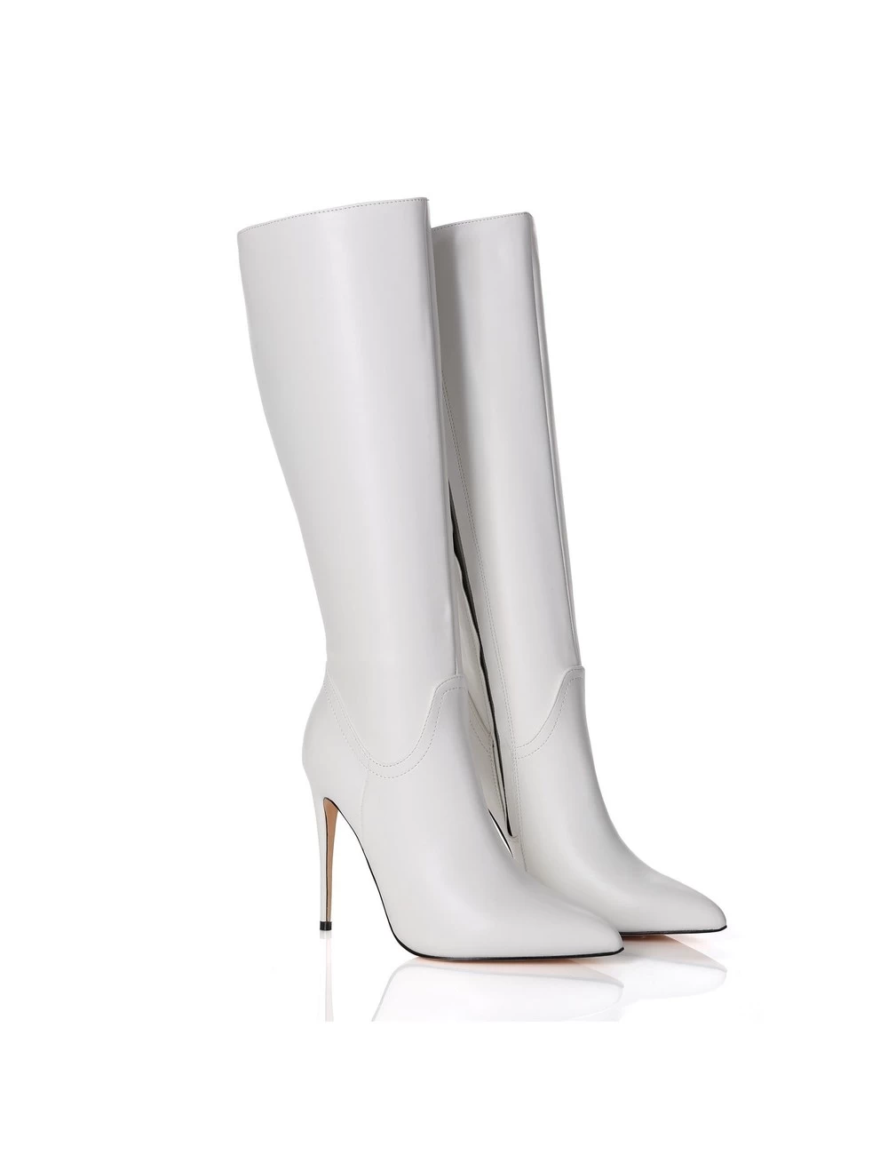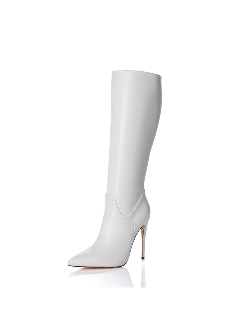 Knee-high elegant Italian style boots with 11cm heels, no platform, red lining and full-length zipper in WHITE MATTE Vegan PU Leather. The BLACK style is new and has a bit lower heels than the previous ZIRA style. Fit and sizing are the same.