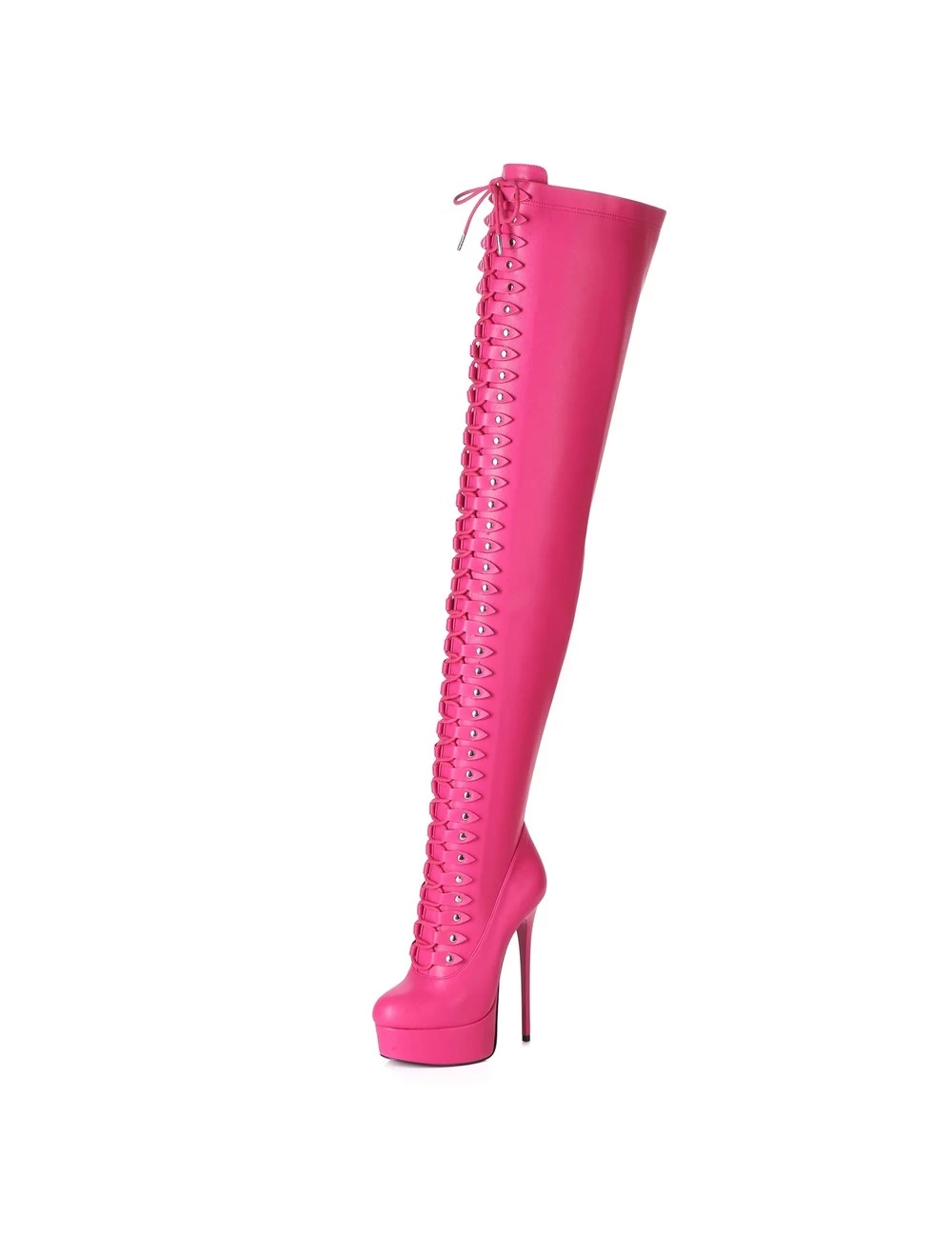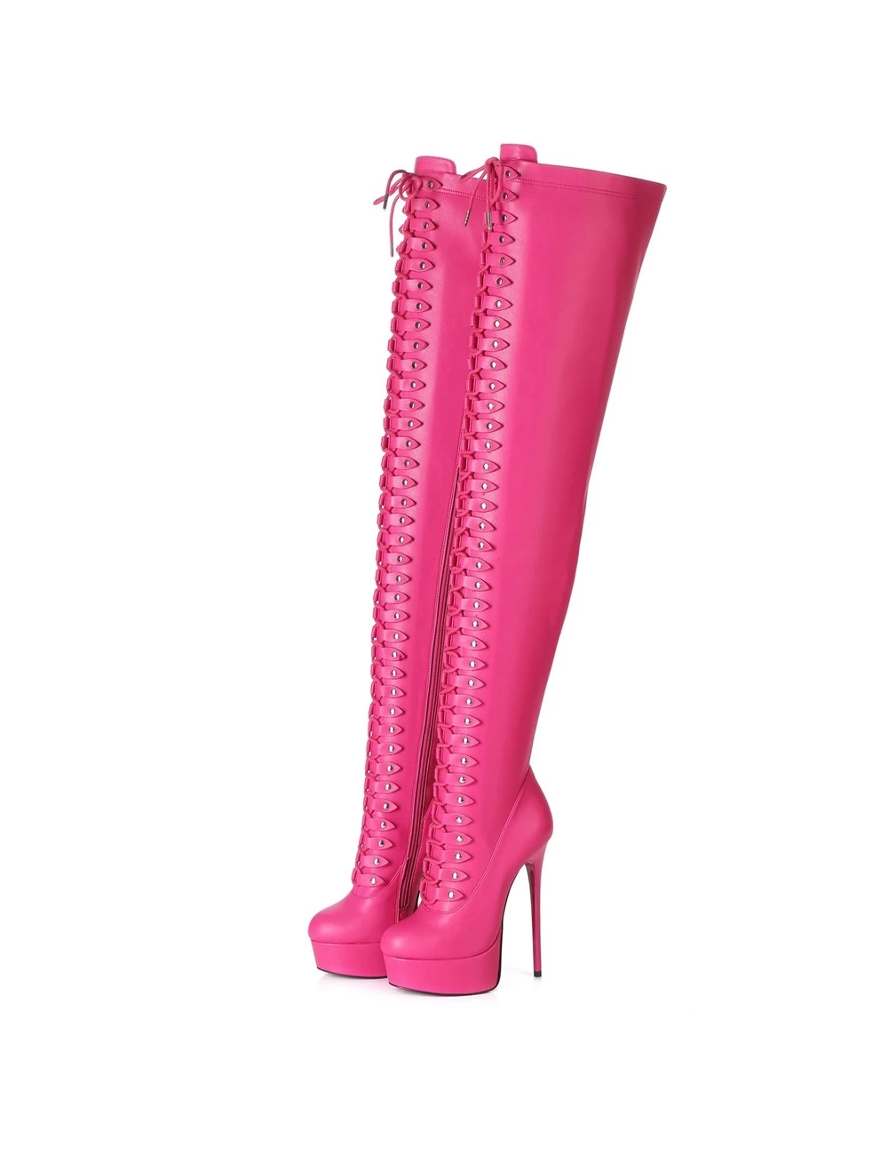 Tight, very long black matte boots from Giaro with extremely high and thin heels and a full lace up style. You will only have to lace up once, there is a full length zipper on the side for easy pull on and pull off. Perfect under a mini skirt or over a shiny legging.