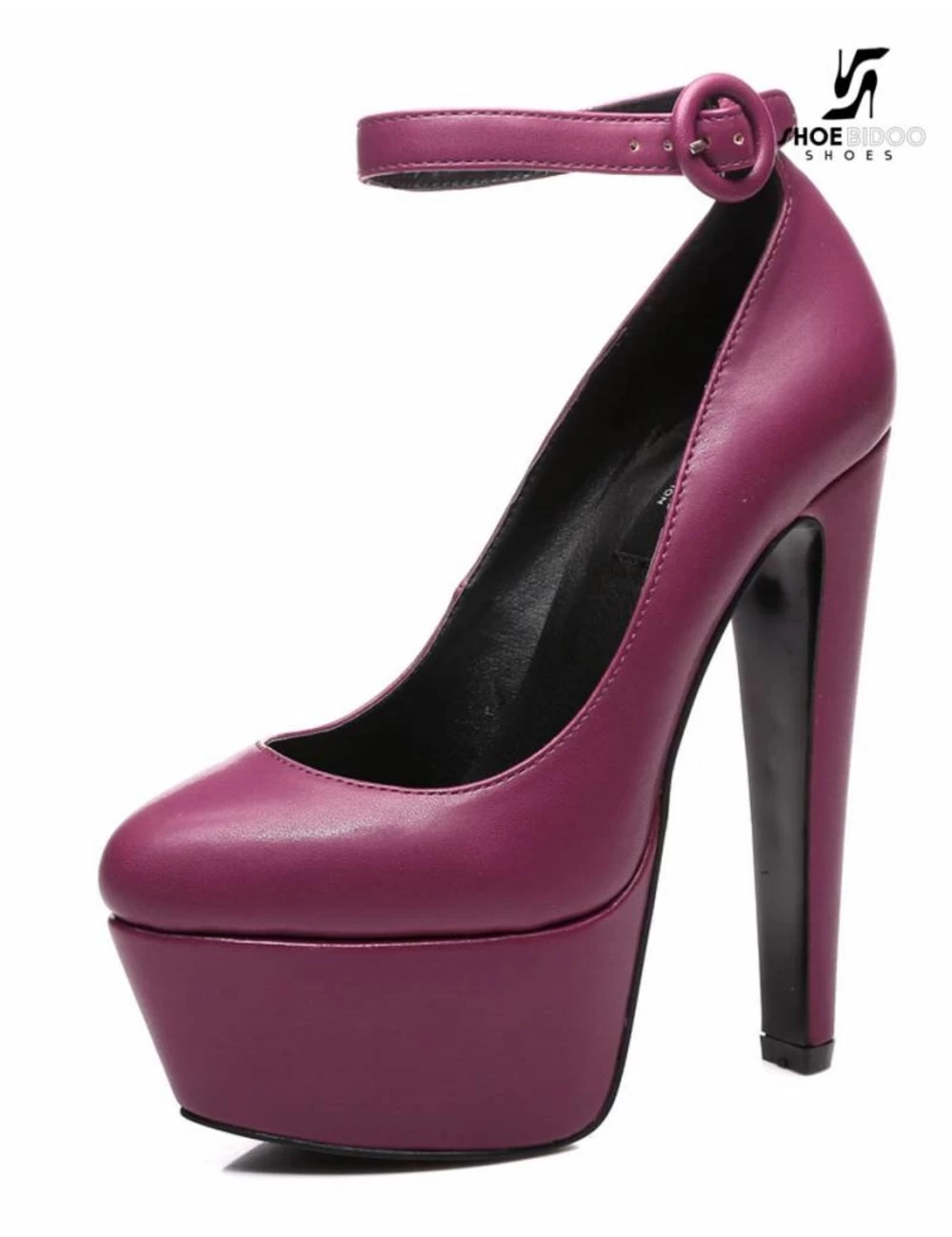 Looking for sturdy high heeled pumps? Got them! These purple leather look pumps with ankle strap from Giaro have chunky 6 inch heels with a 2 inch platform.