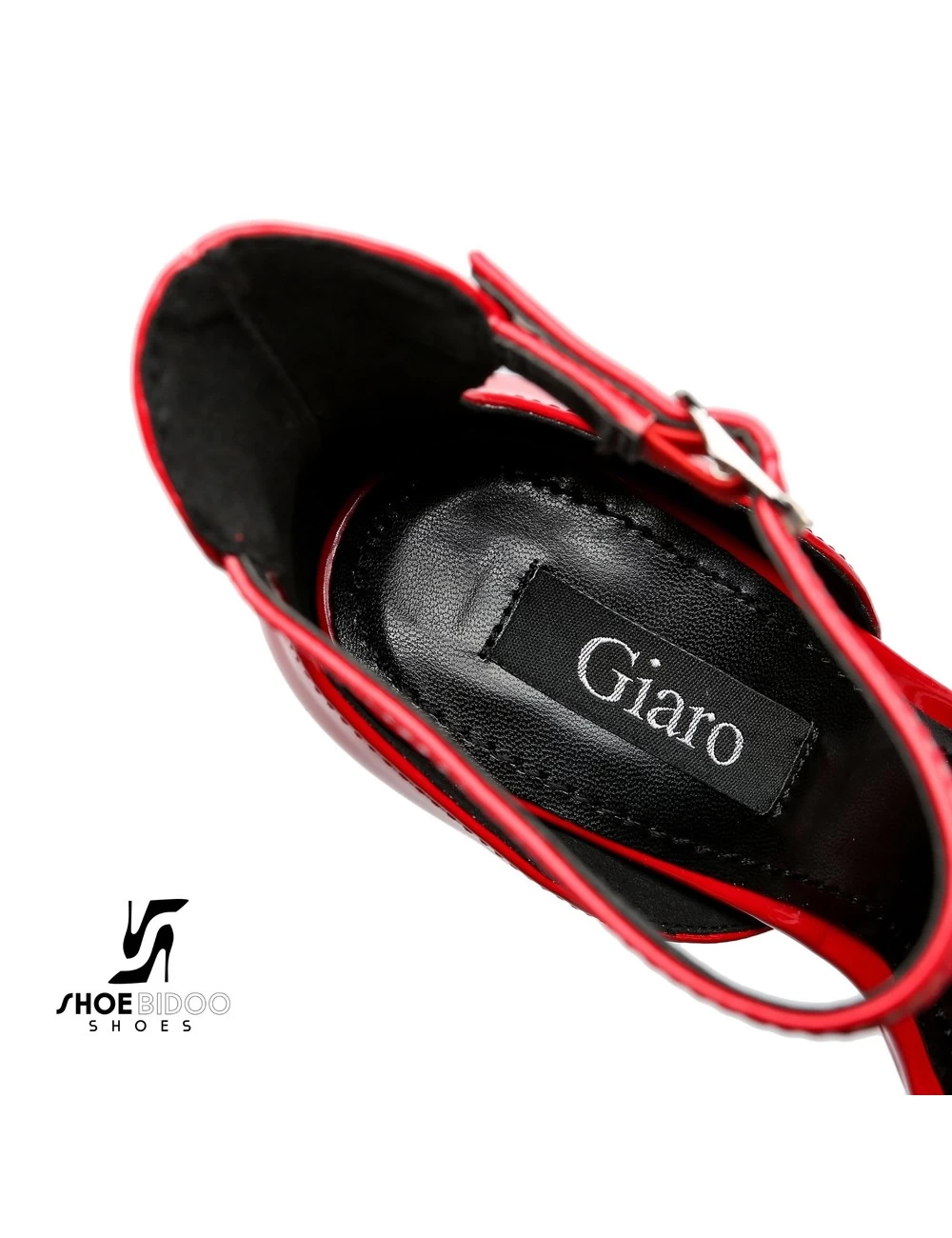 The luxury look. High red shiny platform sandals with very thin heels and high ankle belt.