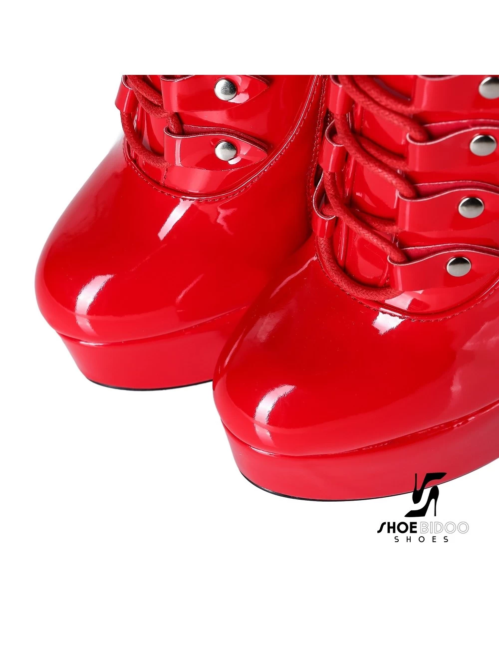 Tight, long knee high red shiny boots from Giaro with extremely high and thin heels and a full lace up style. You will only have to lace up once, there is a full length zipper on the side for easy pull on and pull off. Perfect under a mini skirt or over a shiny legging.