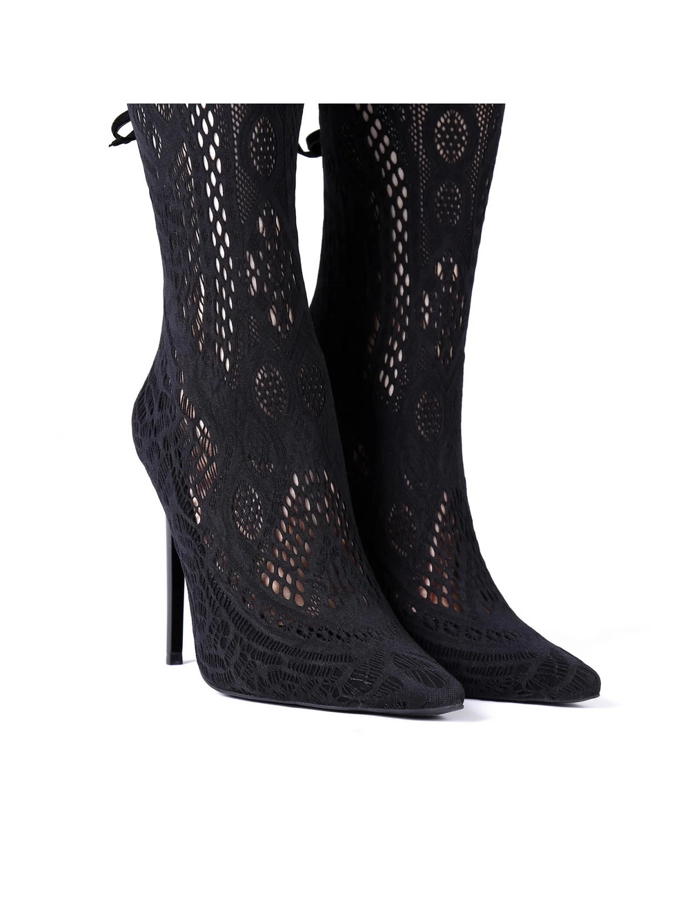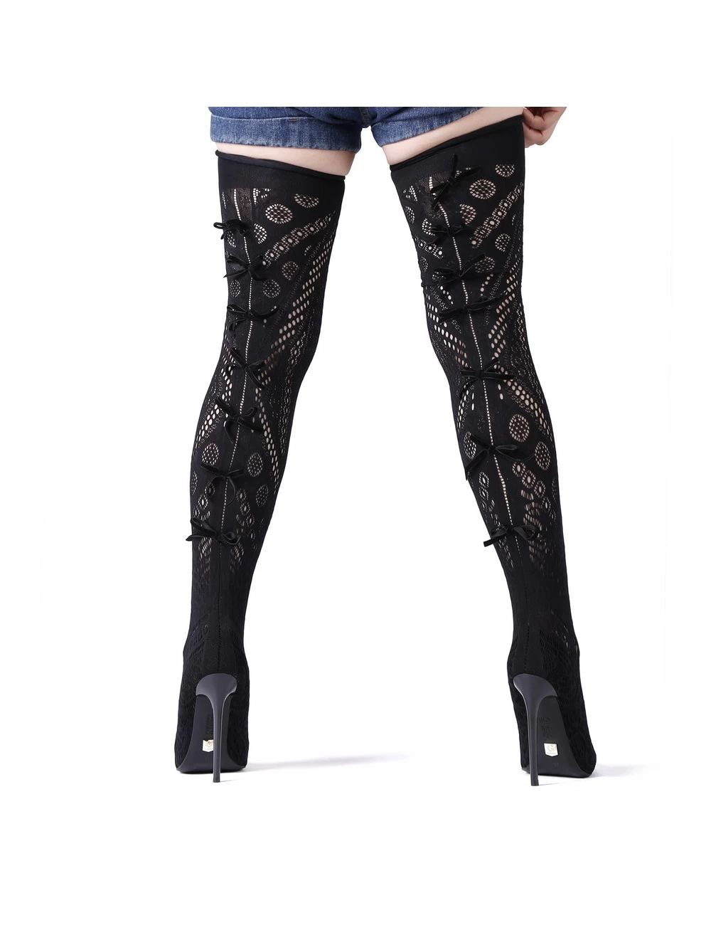Thigh high stretch fabric boots in elegant Italian style with 12cm heels. No platform, pull on style in BLACK. Fit any leg, fabric stretches around the leg. Pumps with black lace stockings attached.
