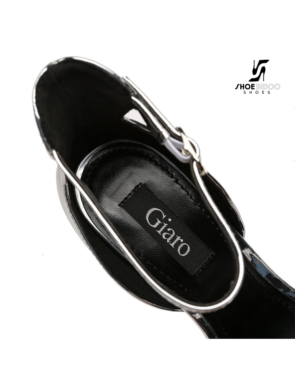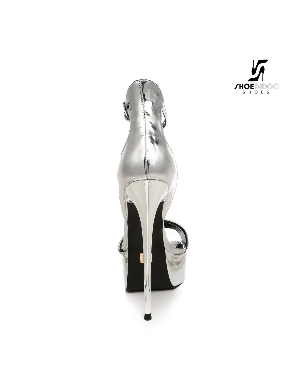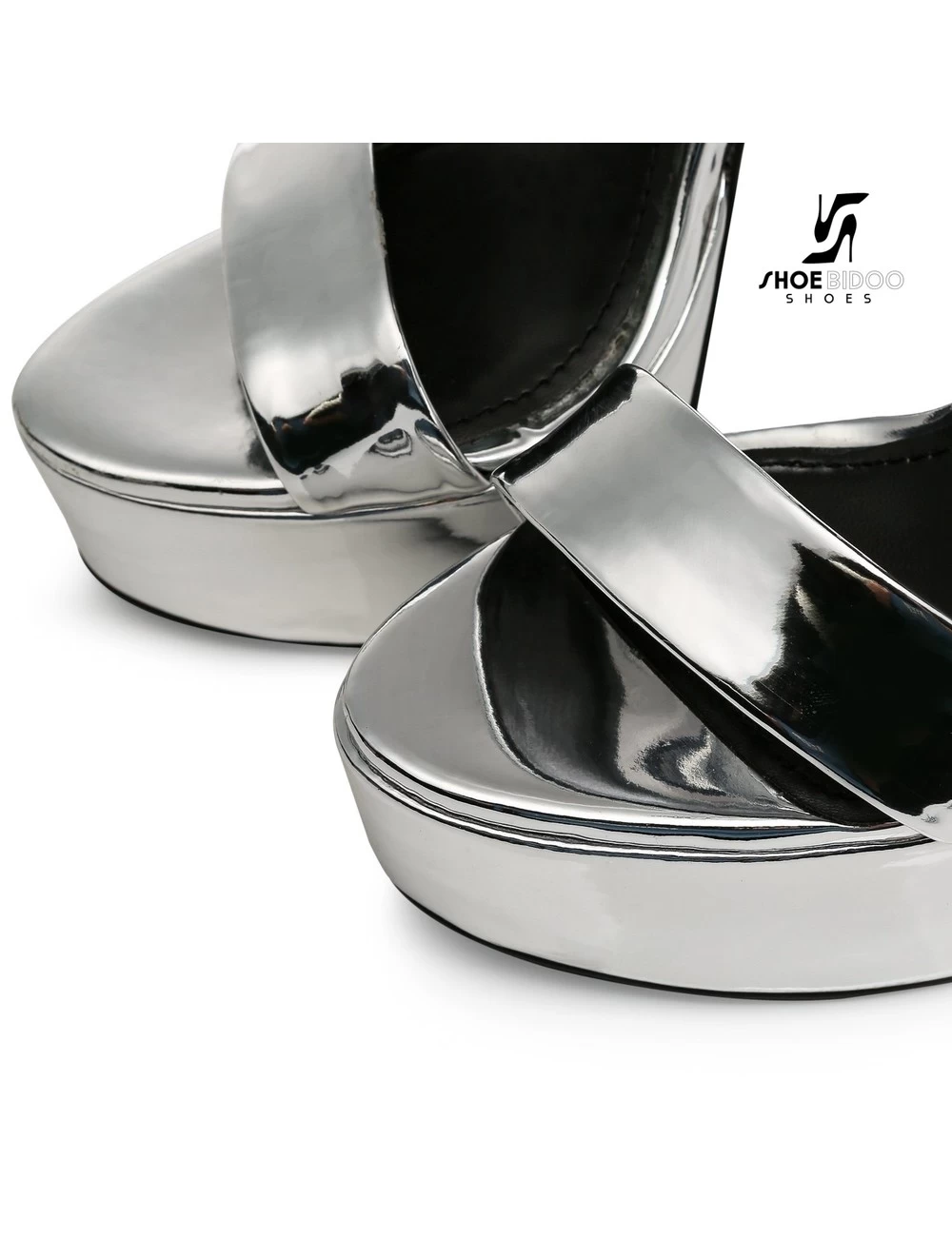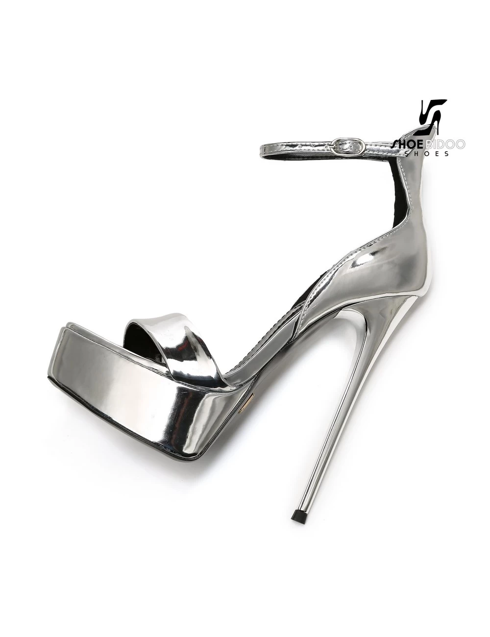 The luxury look. High silver shiny platform sandals with very thin heels and high ankle belt.