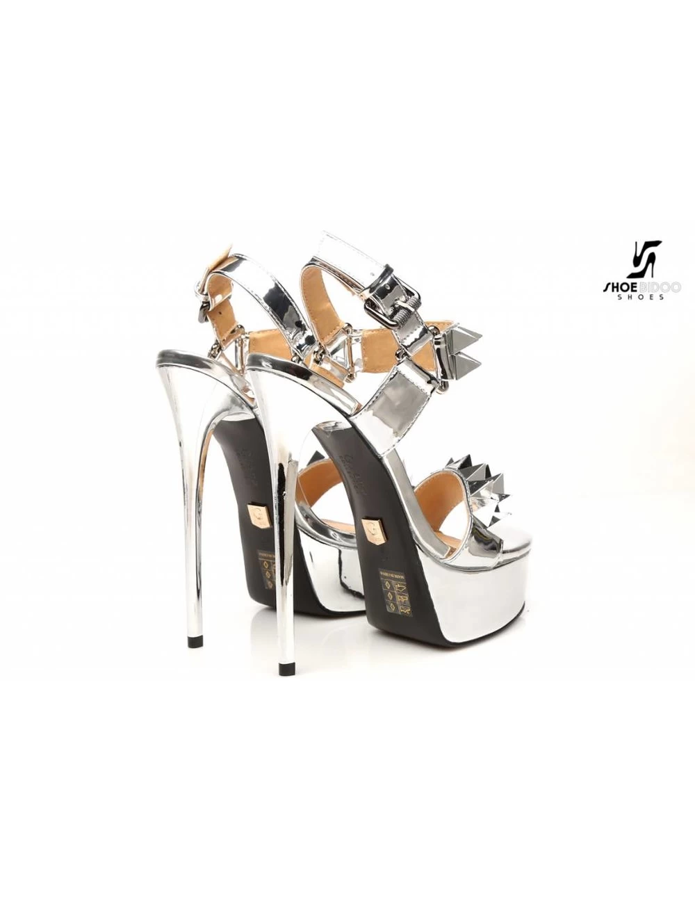 The classic fetish sandals with unique studded ankle straps, now in shiny silver. Open toes and shiny silver material. Long silver shiny heels.