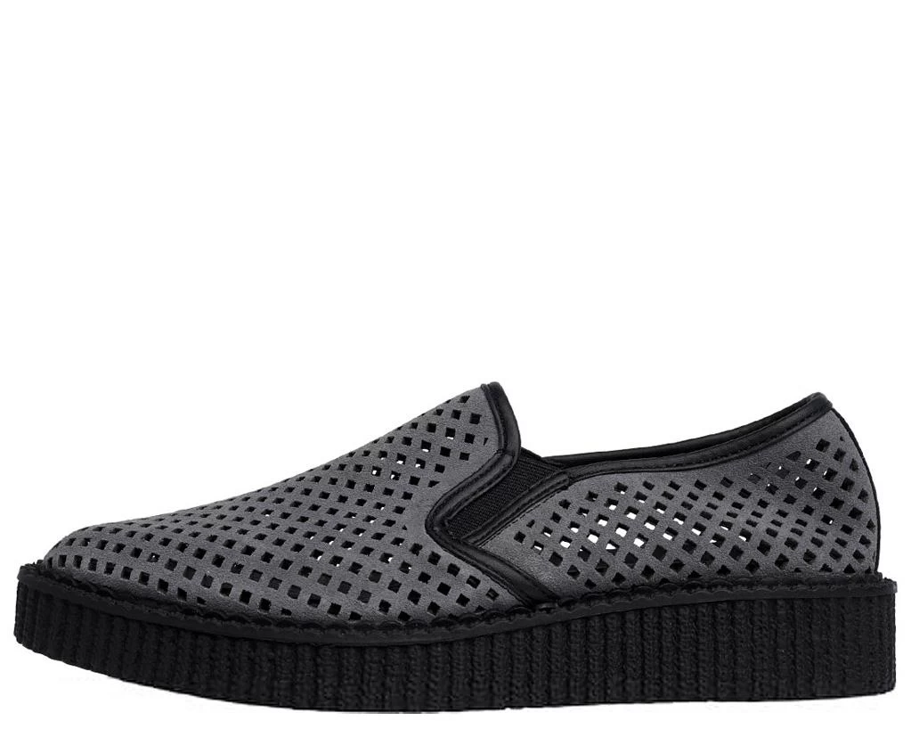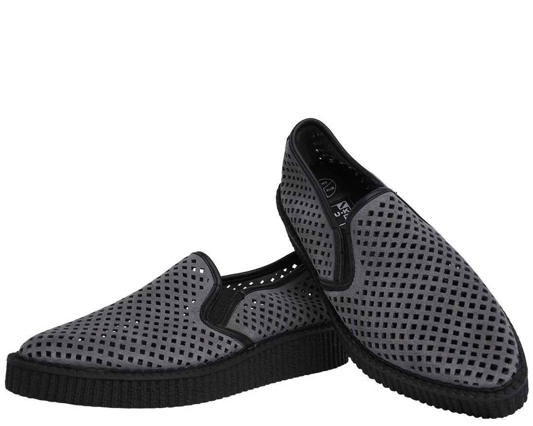 Keep it PERFectly casual, punk, and classy all at once with these pointed slip on creepers! Features a perforated grey cow suede upper and sits on top of a low sole platform that measures 1 ¼” at the heel and ¾” in the front. All the guys and gals will be looking sharp in this one!