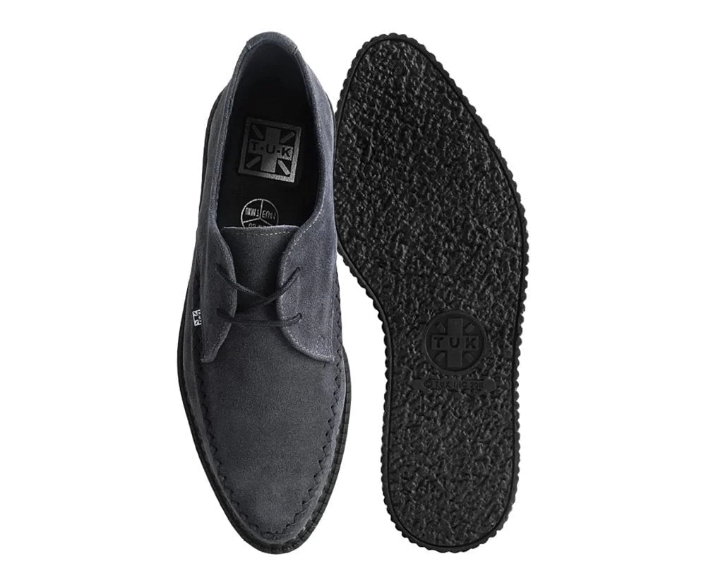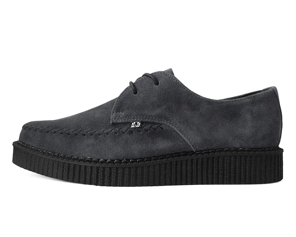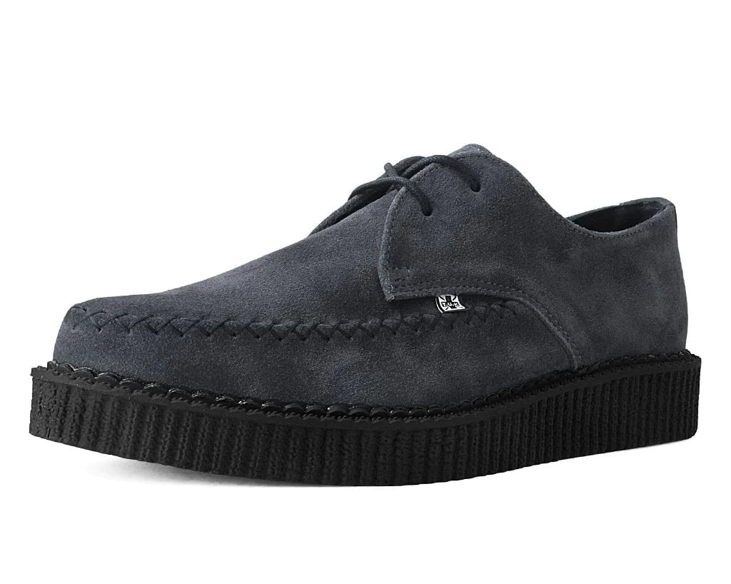 Add some punk to your style. Upper features a grey suede upper, the classic x-stitching & Lace up closure. The T.U.K. Pointed Creeper sole is about 1 1/4 inches high.