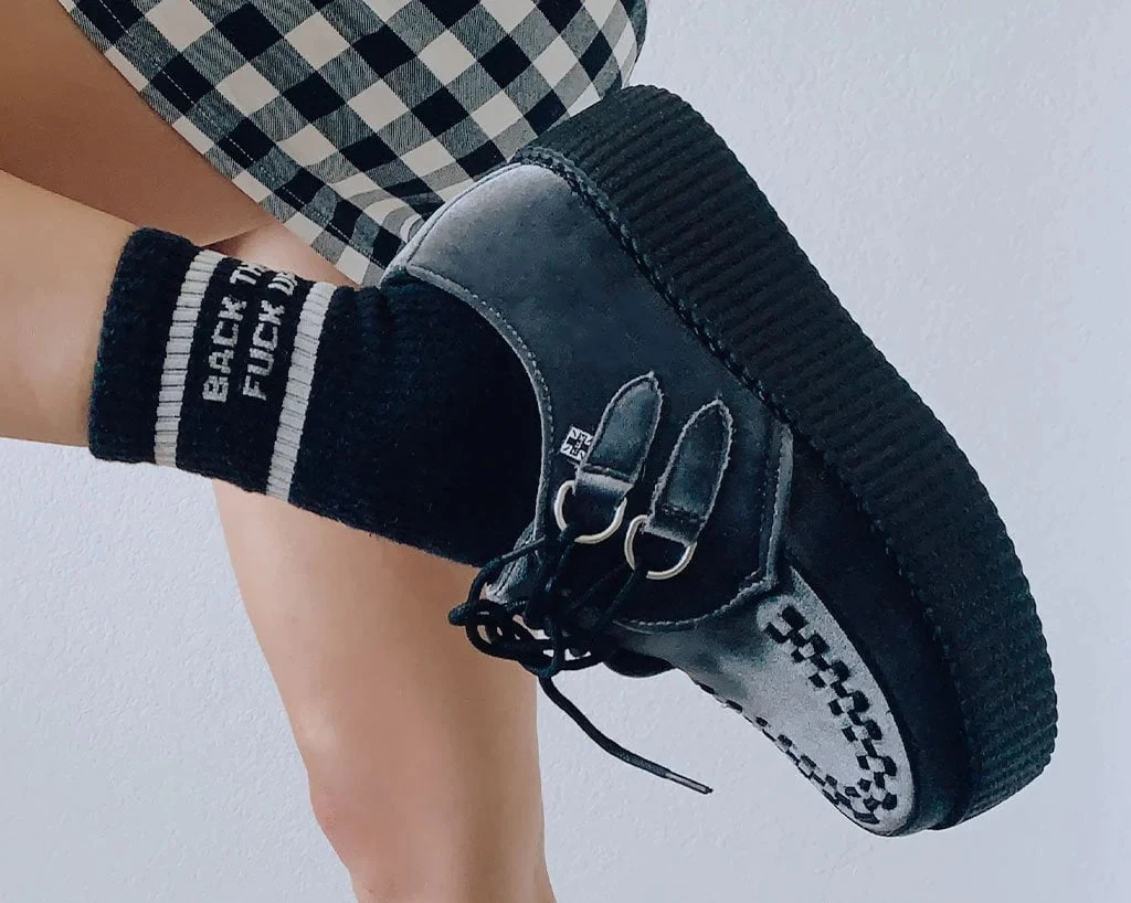Diversify your wardrobe with these super lush vegan friendly creepers. A twist on a classic fave, these babies feature a grey velvet upper that give these creeper shoes a little extra somethin’ somethin’. Has a lightweight VIVA mondo sole that is approximately 1 ¾” at the heel and 1 ¼” in the front. Has removable memory foam padding for added comfort.