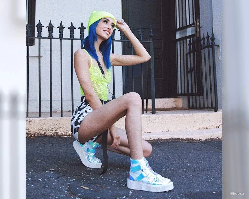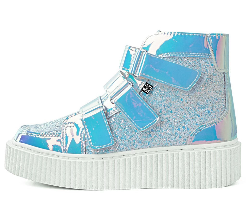 Get your moonwalk on in these outta this world high top creepers. Catch all the double-takes in a gleaming patent holographic and white glitter upper that is vegan friendly. Features triple Velcro straps for easy on/off wear and has a creeper platform height that is about 1 ½” at the heel and 1” in the front. Has removable memory foam insoles for added comfort.
