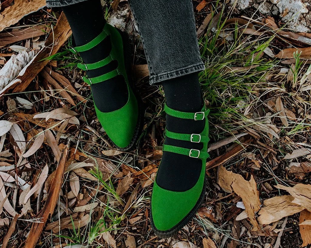 Set the trend in these jade green Mary Janes. Features a microfiber upper, pointed-shaped toe and multi-strap closure for an adjustable fit. Sits on top of a low sole creeper platform that measures 1 ¼” at the heel and ¾” in the front. Has a back zipper for easy on/off wear and removable memory foam padding for added comfort.