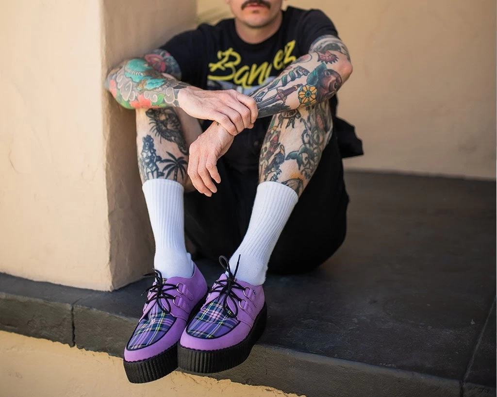 For those classic creeper lovers. Features tartan fabric apron, lace-up fastening, and our lightweight VIVA mondo sole that is approximately 1 ¾” at the heel and 1 ¼” in the front. Has a lavender microfiber upper. Includes a removable memory foam insoles for added comfort.