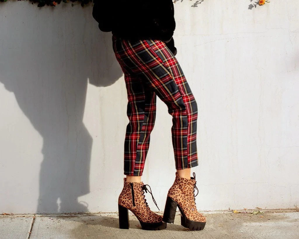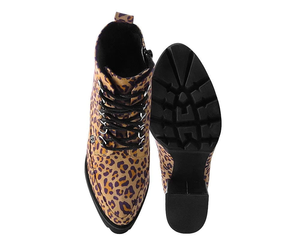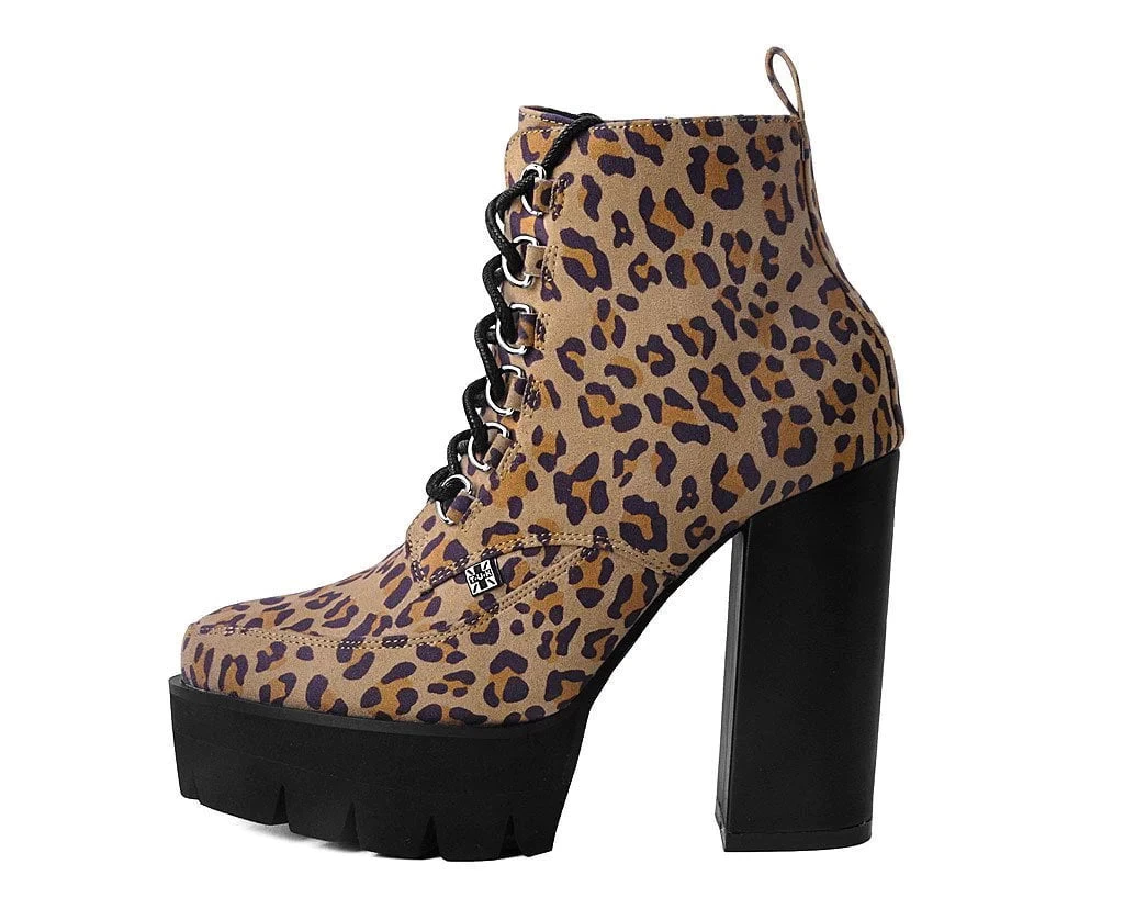 Stand out from the pack with fierce style. Features a vegan friendly brown leopard upper with a 4 3/4” chunky block heel height and a 1.5” platform front for a sturdy elevated lift. Has a pointed toe silhouette with black laces and features an inside zipper for easy on/off wear.