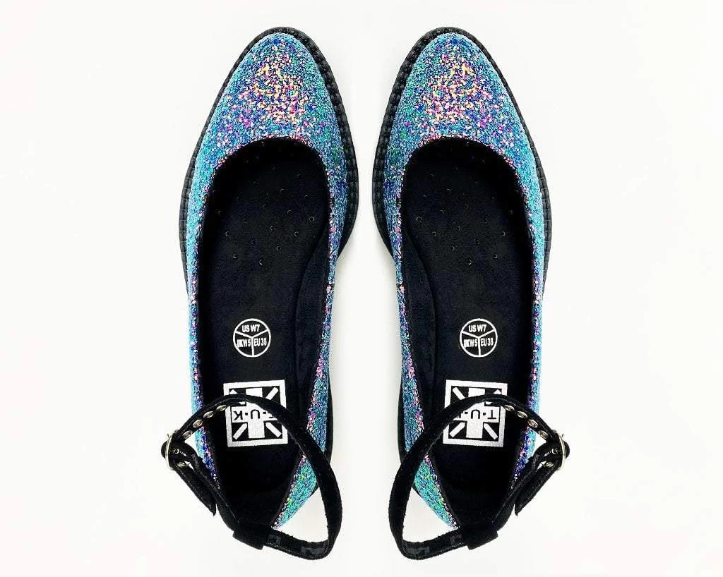 A serious statement shoe. Look cute AF with the perfect combo of a ballet flat and creeper platform construction. Features a vegan friendly rainbow iridescent glitter upper and a sleek pointed-shaped toe. Sits on top of a low sole creeper platform that measures 1 ¼” at the heel and ¾” in the front, ankle strap closure for a secure fit, and removable memory foam padding for added comfort.