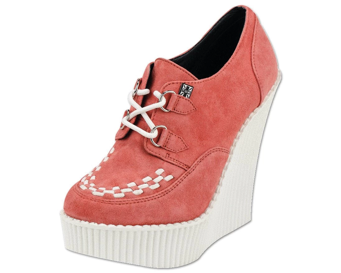 Let these Creeper Wedges take you away into Spring sherbet bliss. The high grade peachy coral color suede is soft and creamy like a spoonful of sherbet on a warm Spring day. The white laces, interlace and sole add a light, breezy feel and the petite d-ring tabs and silver metal d-rings tie them into a classic creeper look. The ridged PU sole is lightweight and the height ranges from about 5 1/4 inches in the back to 1 1/4 inches in the front.