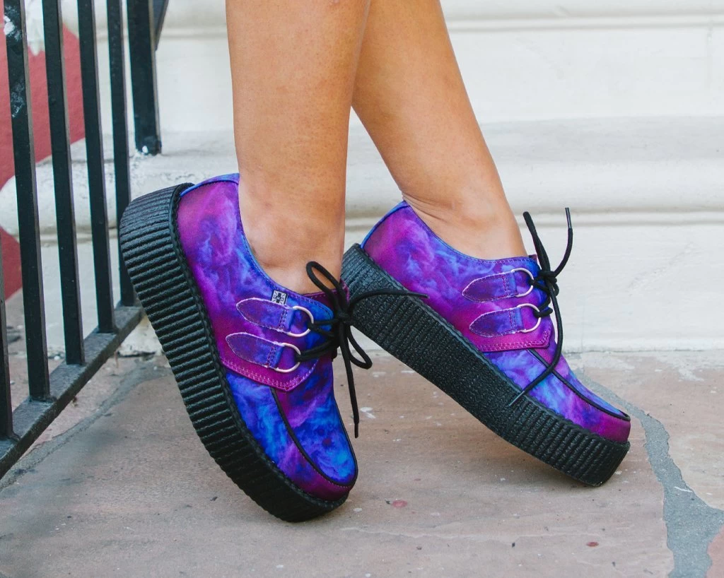 Keep your head in the clouds with these cloudy creepers. Has blue & purple cloud print upper made of a vegan friendly material. Features lace-up fastening and our lightweight VIVA mondo sole that is approximately 1 ¾” at the heel and 1 ¼” in the front. Has removable memory foam padding for added comfort.