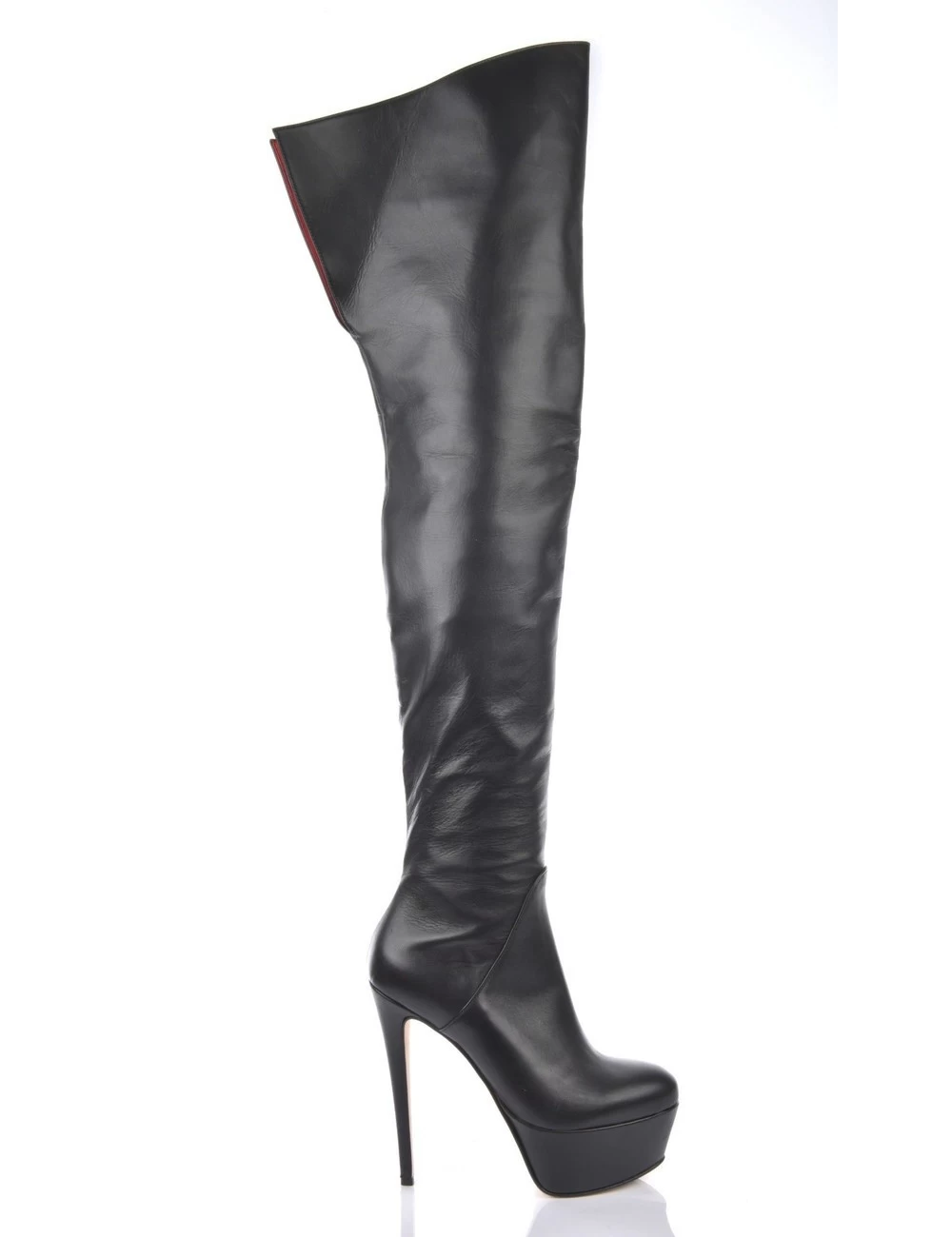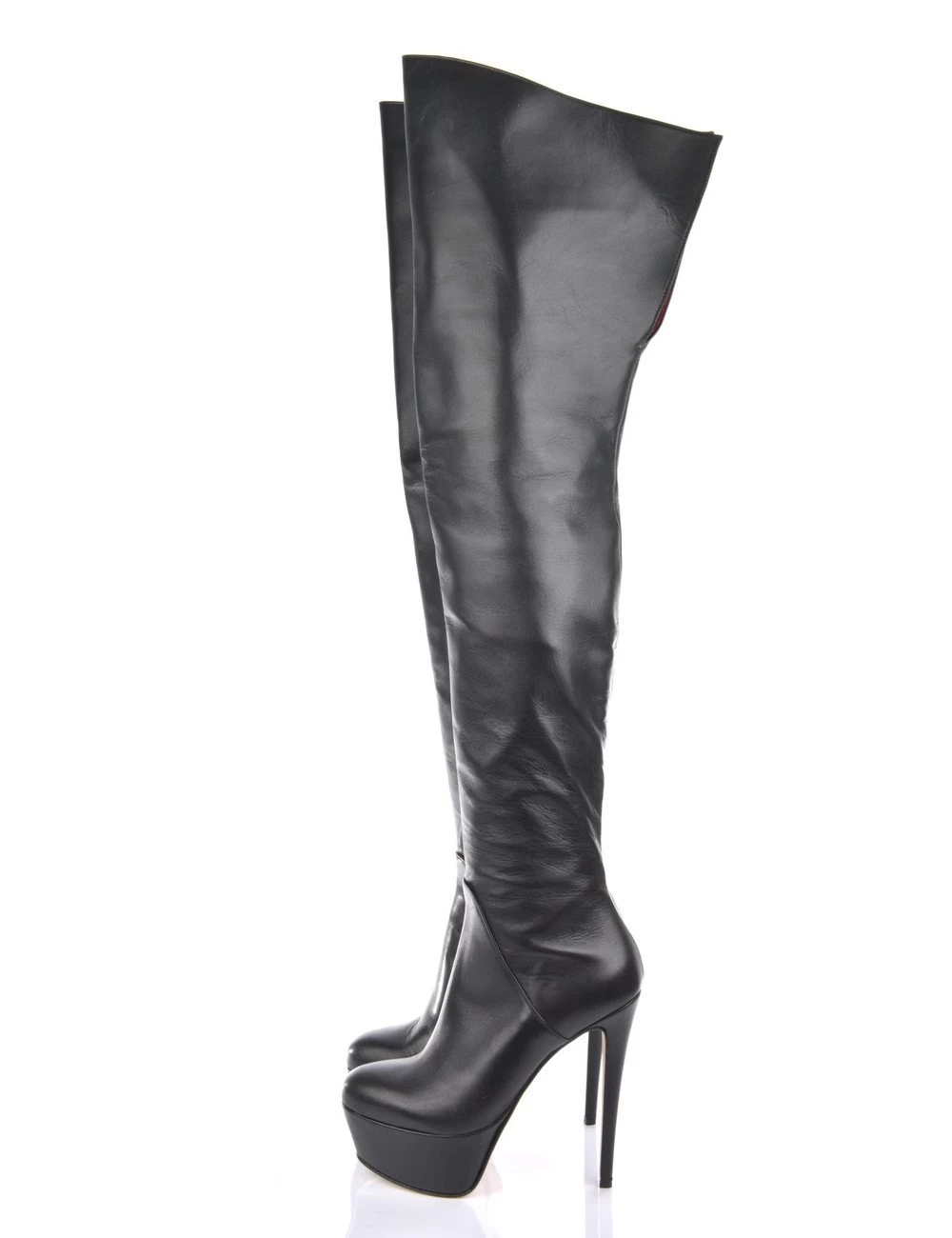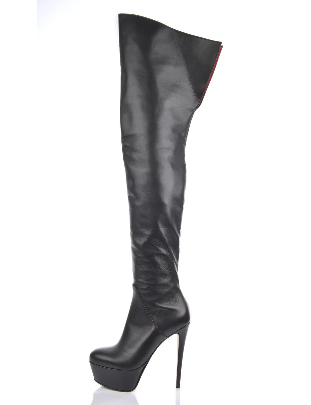 The leather on these thigh boots is a bit ticker on the top so the shafts stay straight and close to your thigh. This gives a beautiful view on the red inner leather when walking.Â