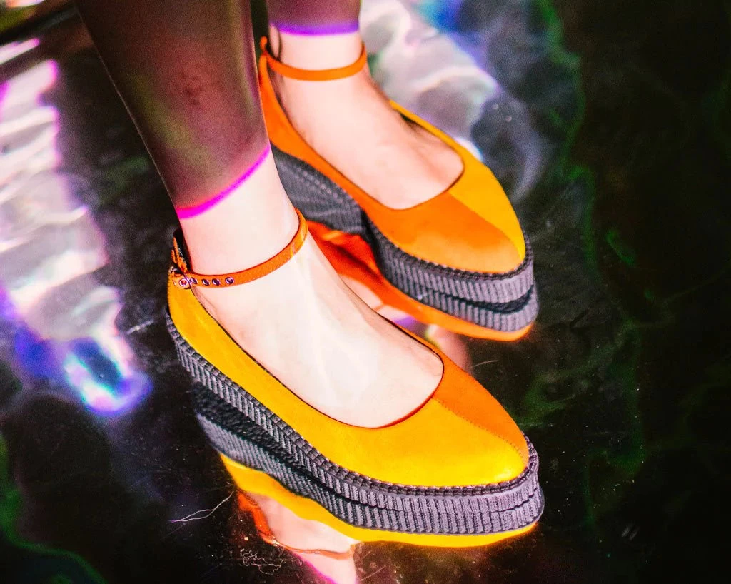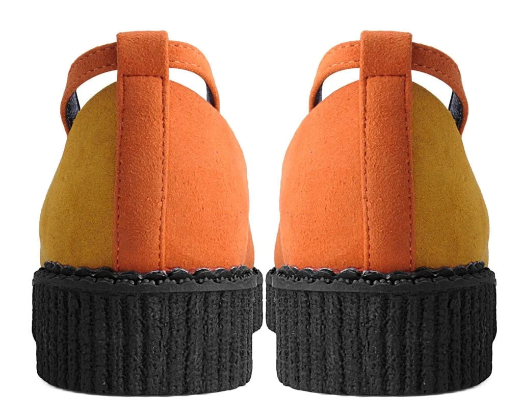 You can refer to these as your dream shoes. A color update to everyone’s favorite classic Mary Janes. Features a two-tone mustard yellow & orange faux suede upper with pointed toe construction and ankle strap closure for an adjustable fit. Sits on top of a low sole creeper platform that measures 1 ¼” at the heel and ¾” in the front. Has removable memory foam padding for added comfort.