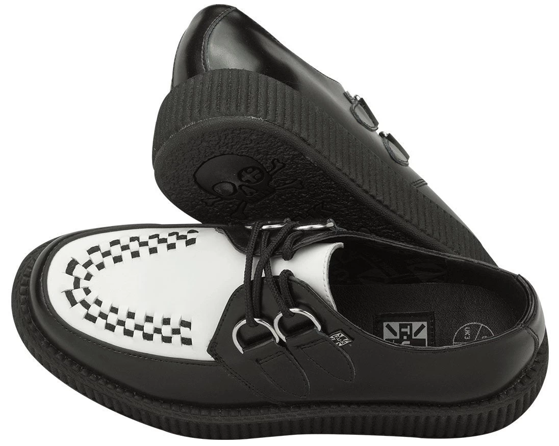 These black and white leather T.U.K. Viva low sole Creepers feature the new lightweight and more flexible soles in our traditional 1 1/2″ low sole height. These creepers have a black woven interlace, and silver metal D-rings.