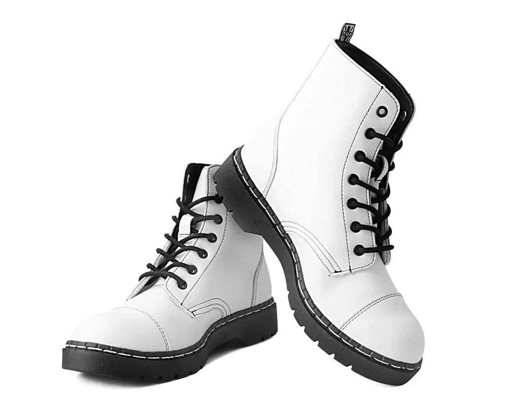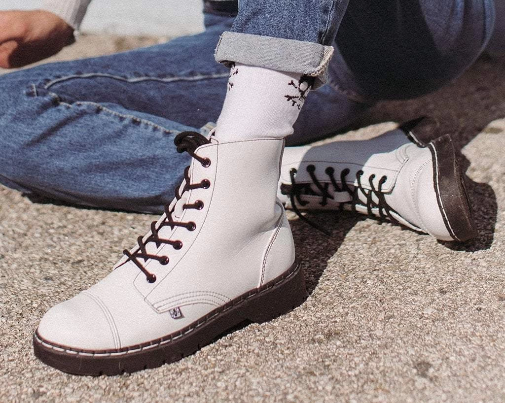 Boots for the rad. Features a vegan friendly, white faux leather upper with 7-eye lace-up detail. Has a 1” heel, removable memory foam padding for added comfort.